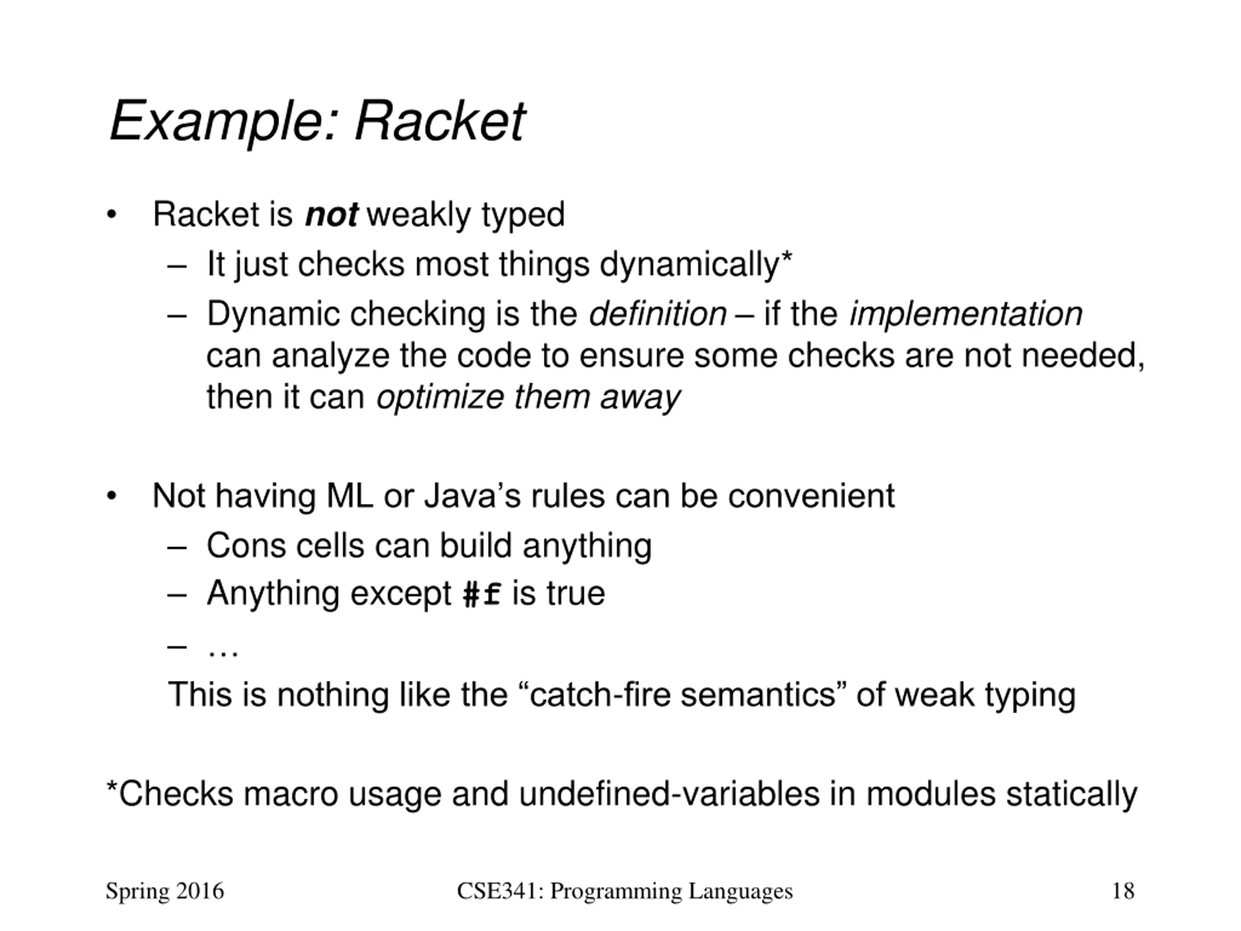 Example: Racket Racket is not weakly typed It just checks most things dynamically* Dynamic checking is the definition if the implementation can analyze the code to ensure some checks are not needed, then it can optimize them away Not having ML or Java s rules can be convenient Cons cells can build anything Anything except #f is true This is nothing like the catch-fire semantics of weak typing *Checks macro usage and undefined-variables in modules statically Spring 2016 CSE341: Programming Languages 18