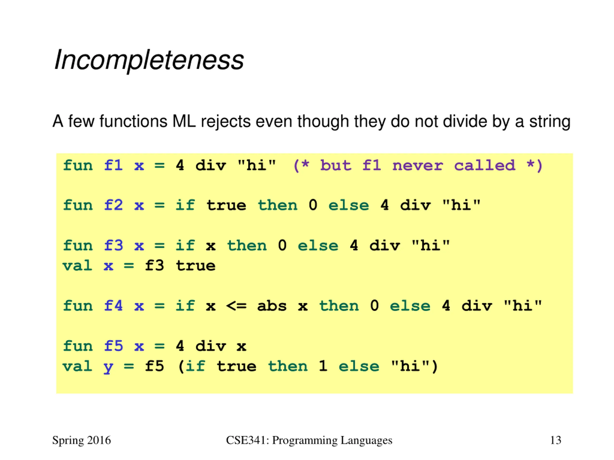 Incompleteness A few functions ML rejects even though they do not divide by a string fun f1 x = 4 div "hi"(* but f1 never called *) fun f2 x = if true then 0 else 4 div "hi" fun f3 x = if x then 0 else 4 div "hi" val x = f3 true fun f4 x = if x <= abs x then 0 else 4 div "hi" fun f5 x = 4 div x val y = f5 (if true then 1 else "hi") Spring 2016 CSE341: Programming Languages 13