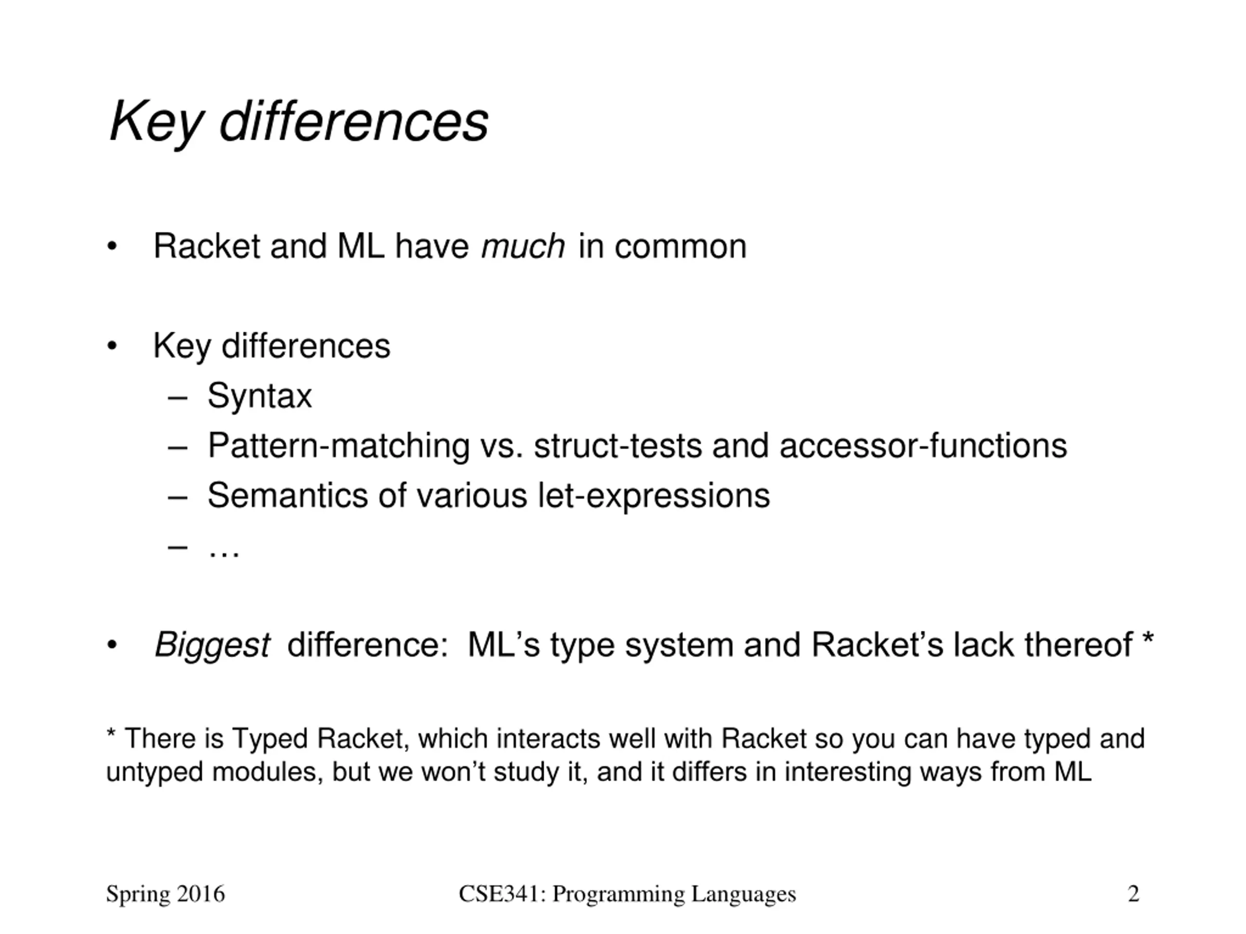 Key differences Racket and ML have much in common Key differences Syntax Pattern-matching vs. struct-tests and accessor-functions Semantics of various let-expressions Biggest difference: ML s type system and Racket s lack thereof * * There is Typed Racket, which interacts well with Racket so you can have typed and untyped modules, but we won t study it, and it differs in interesting ways from ML Spring 2016 CSE341: Programming Languages 2