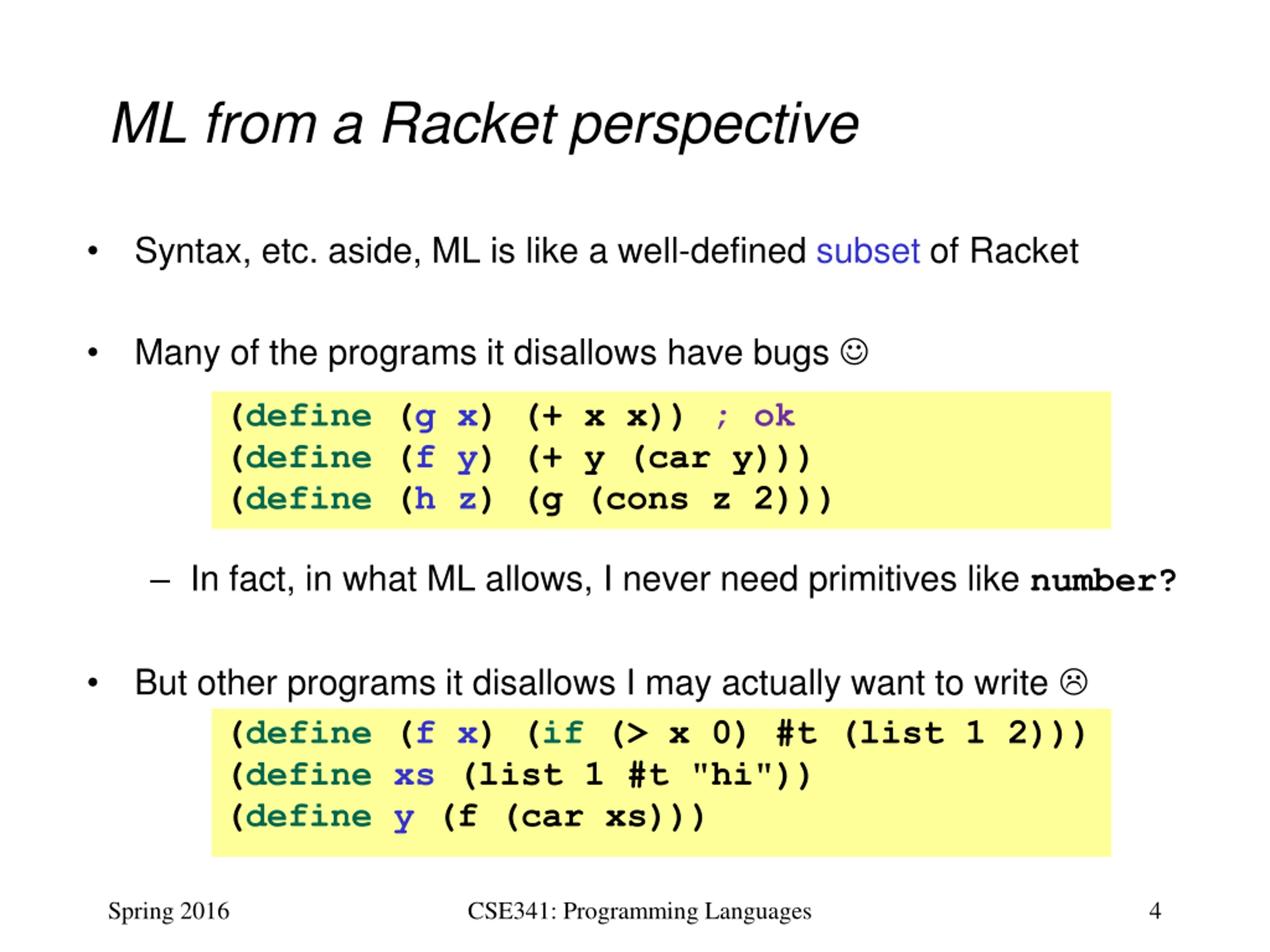 Upcoming topics Coming soon: What is type-checking? Static typing? Dynamic typing? Etc. Why is type-checking approximate? What are the advantages and disadvantages of type-checking? But first to better appreciate ML and Racket: How could a Racket programmer describe ML? How could an ML programmer describe Racket? Spring 2016 CSE341: Programming Languages 3