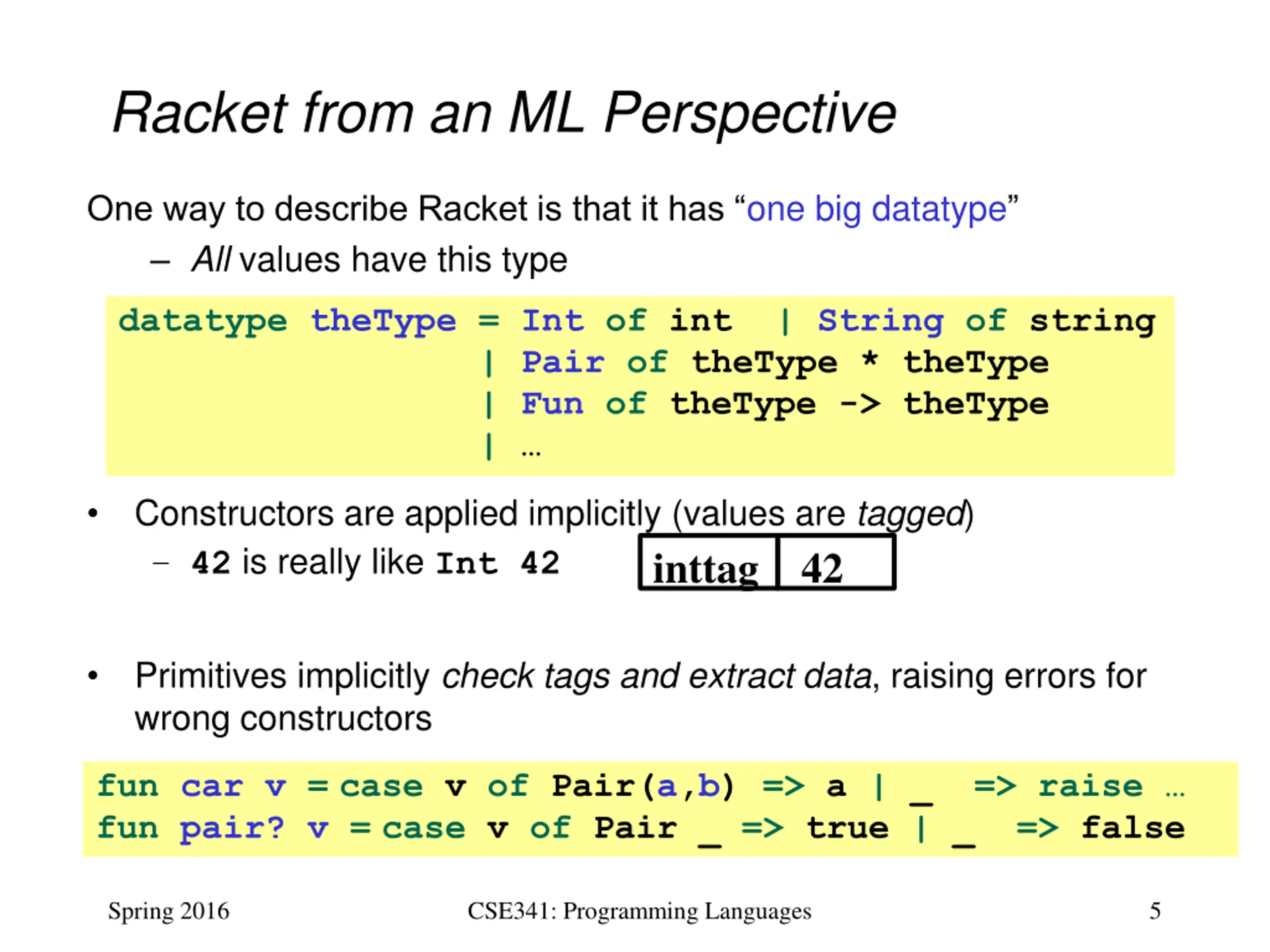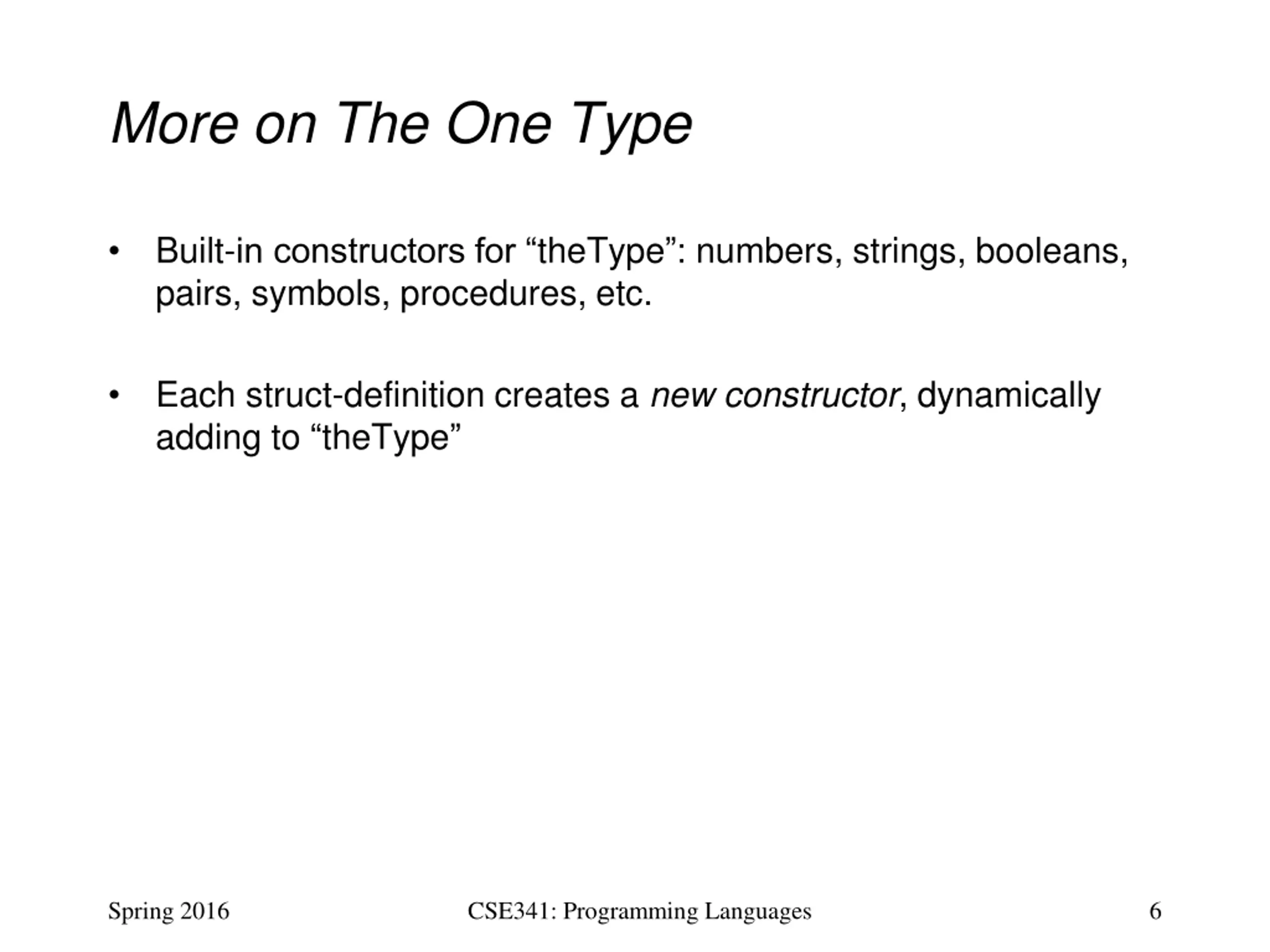 More on The One Type Built-in constructors for theType : numbers, strings, booleans, pairs, symbols, procedures, etc. Each struct-definition creates a new constructor, dynamically adding to theType Spring 2016 CSE341: Programming Languages 6