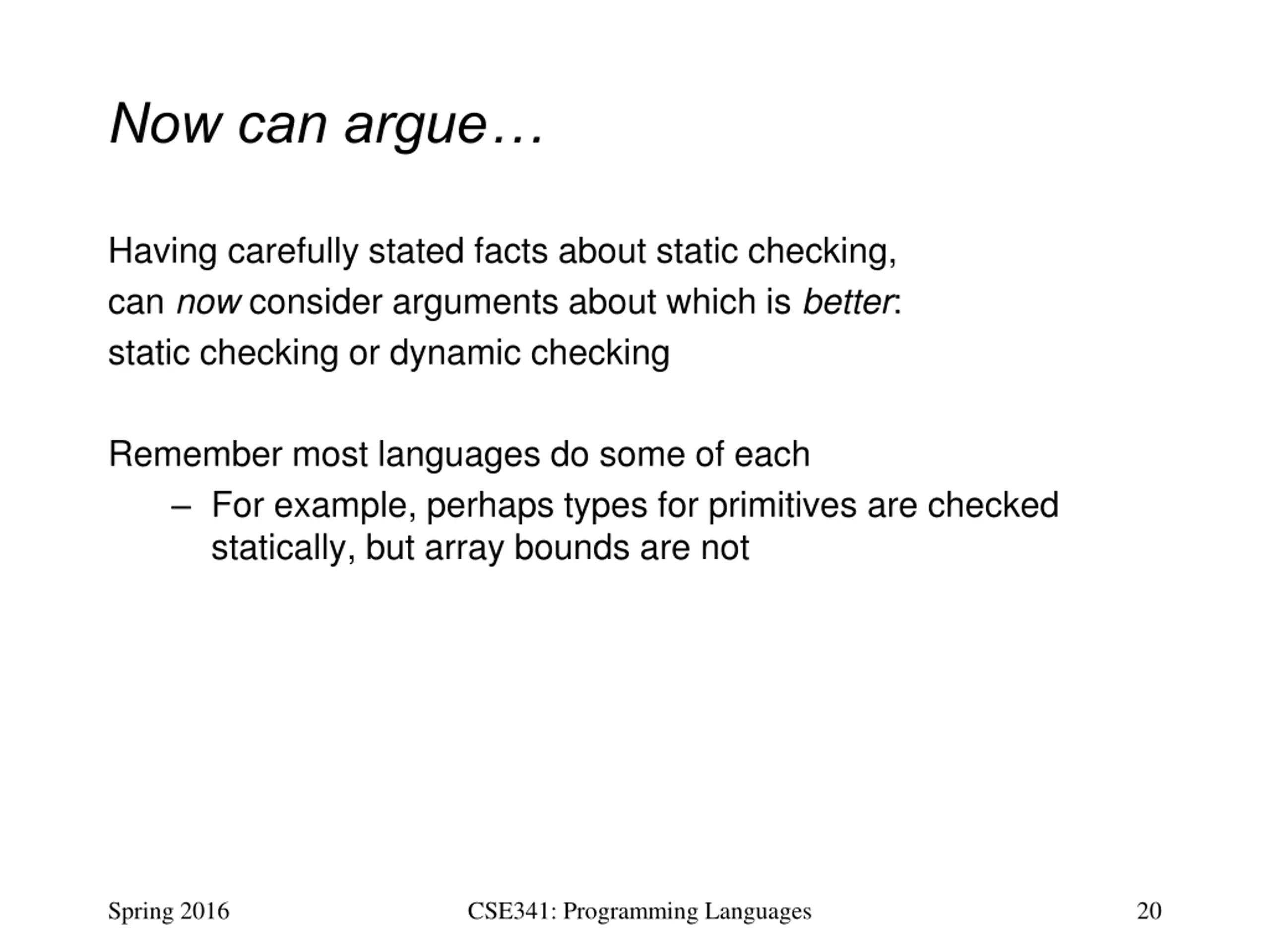 Now can argue Having carefully stated facts about static checking, can now consider arguments about which is better: static checking or dynamic checking Remember most languages do some of each For example, perhaps types for primitives are checked statically, but array bounds are not Spring 2016 CSE341: Programming Languages 20