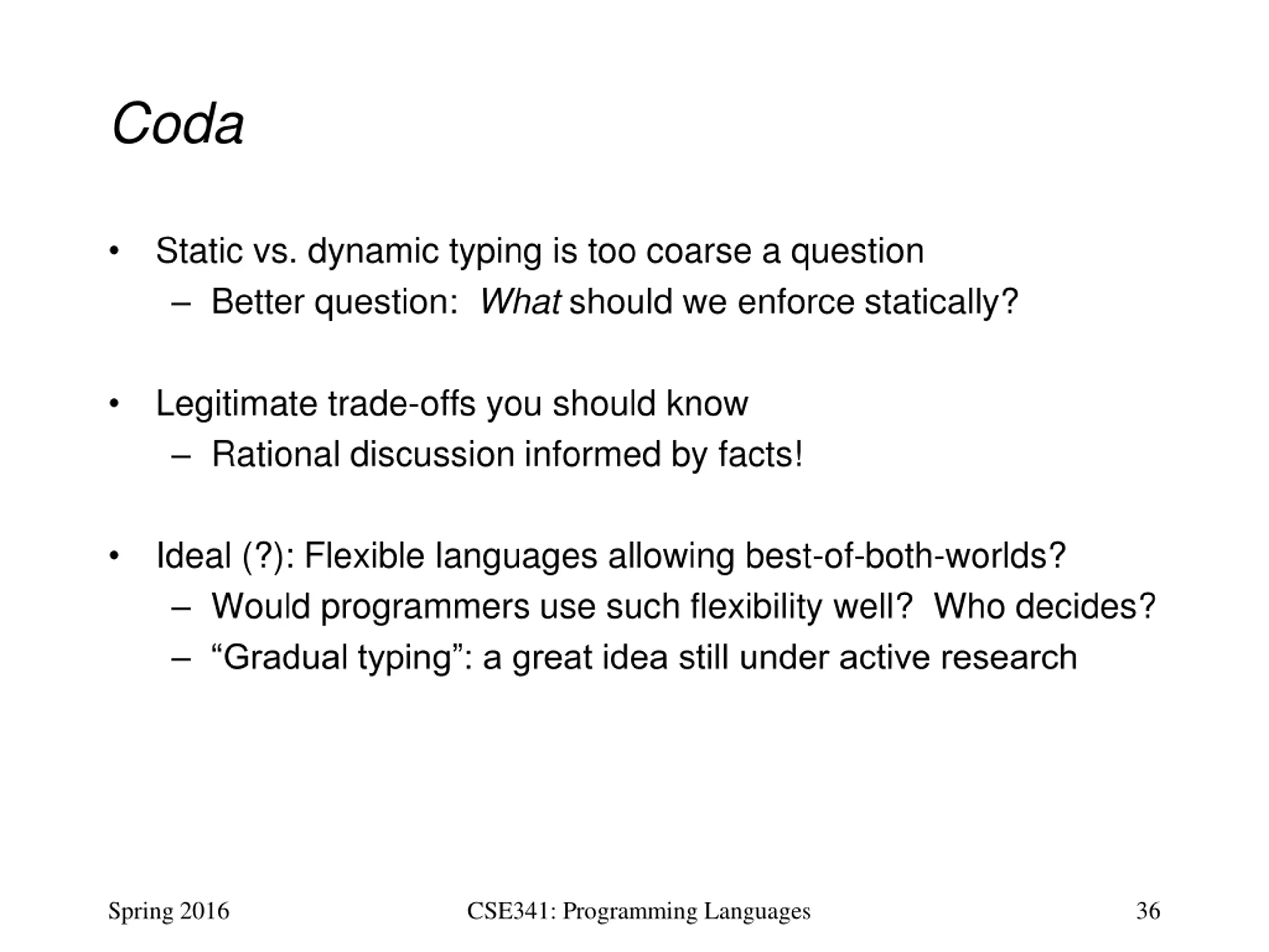Coda Static vs. dynamic typing is too coarse a question Better question: What should we enforce statically? Legitimate trade-offs you should know Rational discussion informed by facts! Ideal (?): Flexible languages allowing best-of-both-worlds? Would programmers use such flexibility well? Who decides? Gradual typing : a great idea still under active research Spring 2016 CSE341: Programming Languages 36