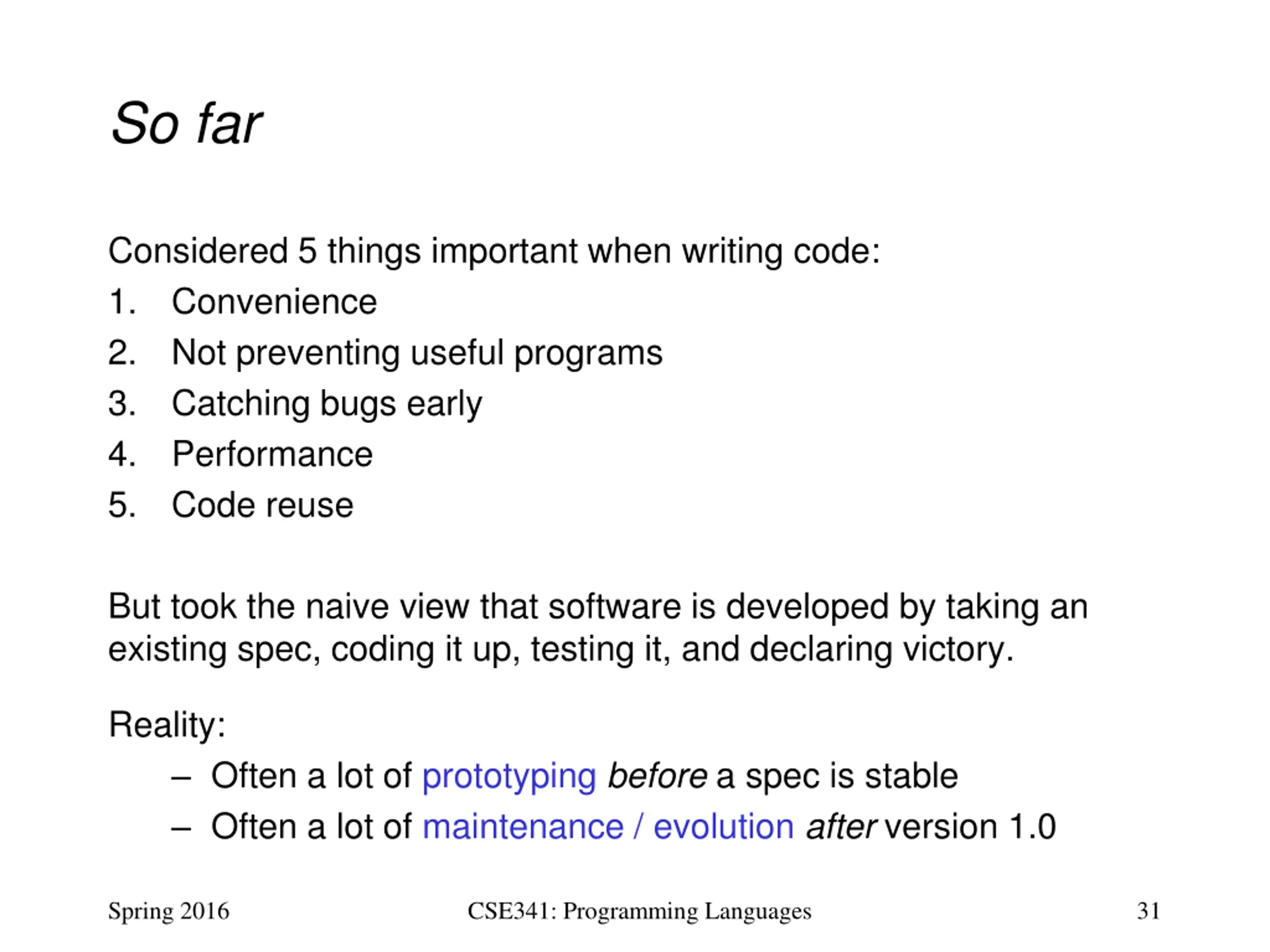 So far Considered 5 things important when writing code: 1. Convenience 2. Not preventing useful programs 3. Catching bugs early 4. Performance 5. Code reuse But took the naive view that software is developed by taking an existing spec, coding it up, testing it, and declaring victory. Reality: Often a lot of prototyping before a spec is stable Often a lot of maintenance / evolution after version 1.0 Spring 2016 CSE341: Programming Languages 31