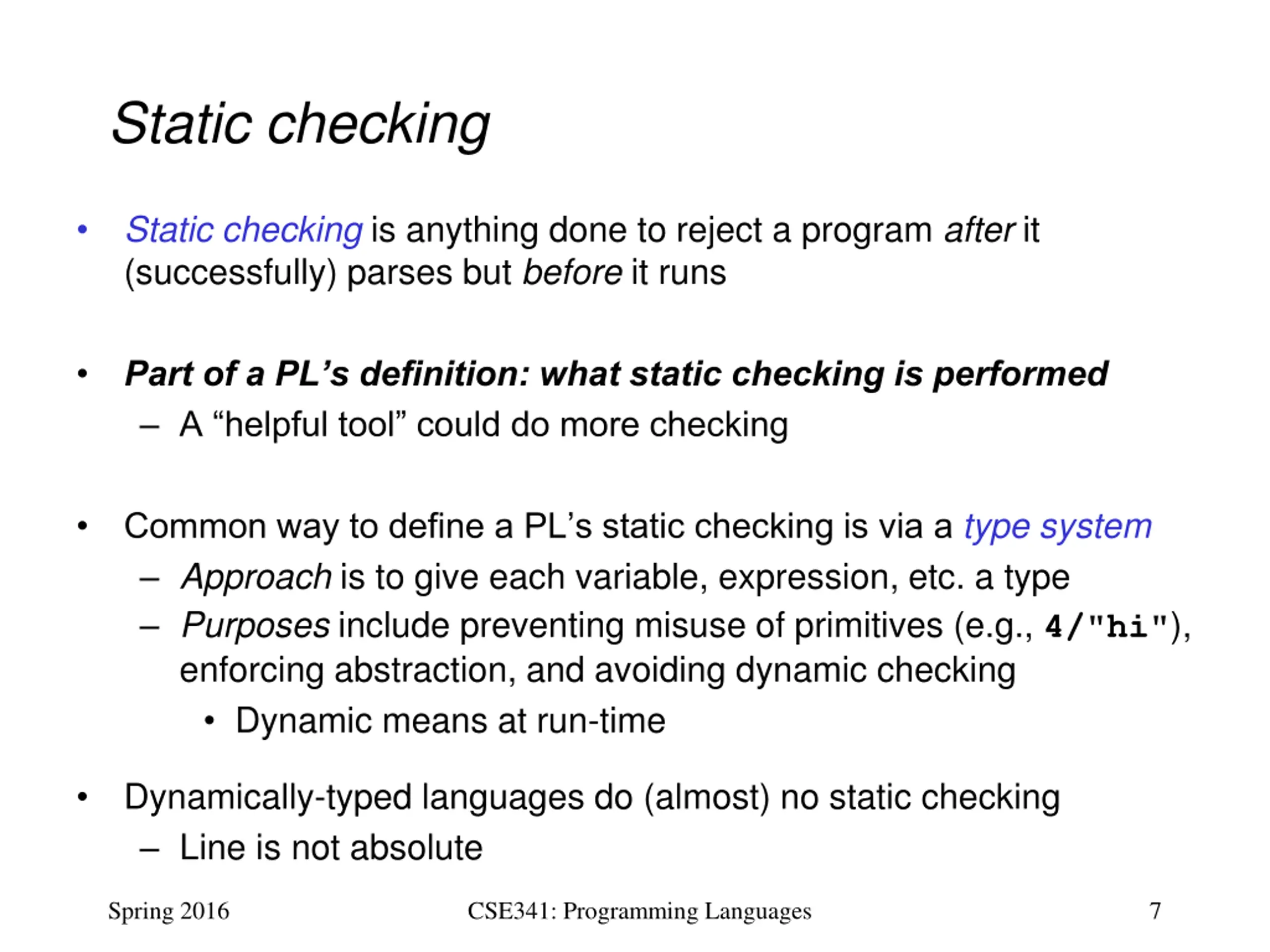 Static checking Static checking is anything done to reject a program after it (successfully) parses but before it runs Part of a PL s definition: what static checking is performed A helpful tool could do more checking Common way to define a PL s static checking is via a type system Approach is to give each variable, expression, etc. a type Purposes include preventing misuse of primitives (e.g., 4/"hi"), enforcing abstraction, and avoiding dynamic checking Dynamic means at run-time Dynamically-typed languages do (almost) no static checking Line is not absolute Spring 2016 CSE341: Programming Languages 7