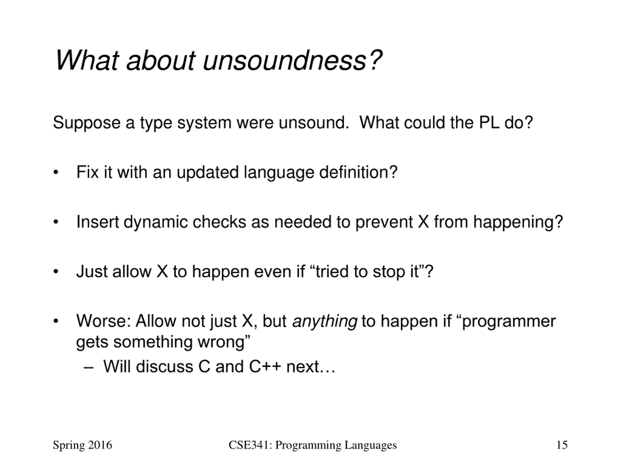 What about unsoundness? Suppose a type system were unsound. What could the PL do? Fix it with an updated language definition? Insert dynamic checks as needed to prevent X from happening? Just allow X to happen even if tried to stop it ? Worse: Allow not just X, but anythingto happen if programmer gets something wrong Will discuss C and C++ next Spring 2016 CSE341: Programming Languages 15