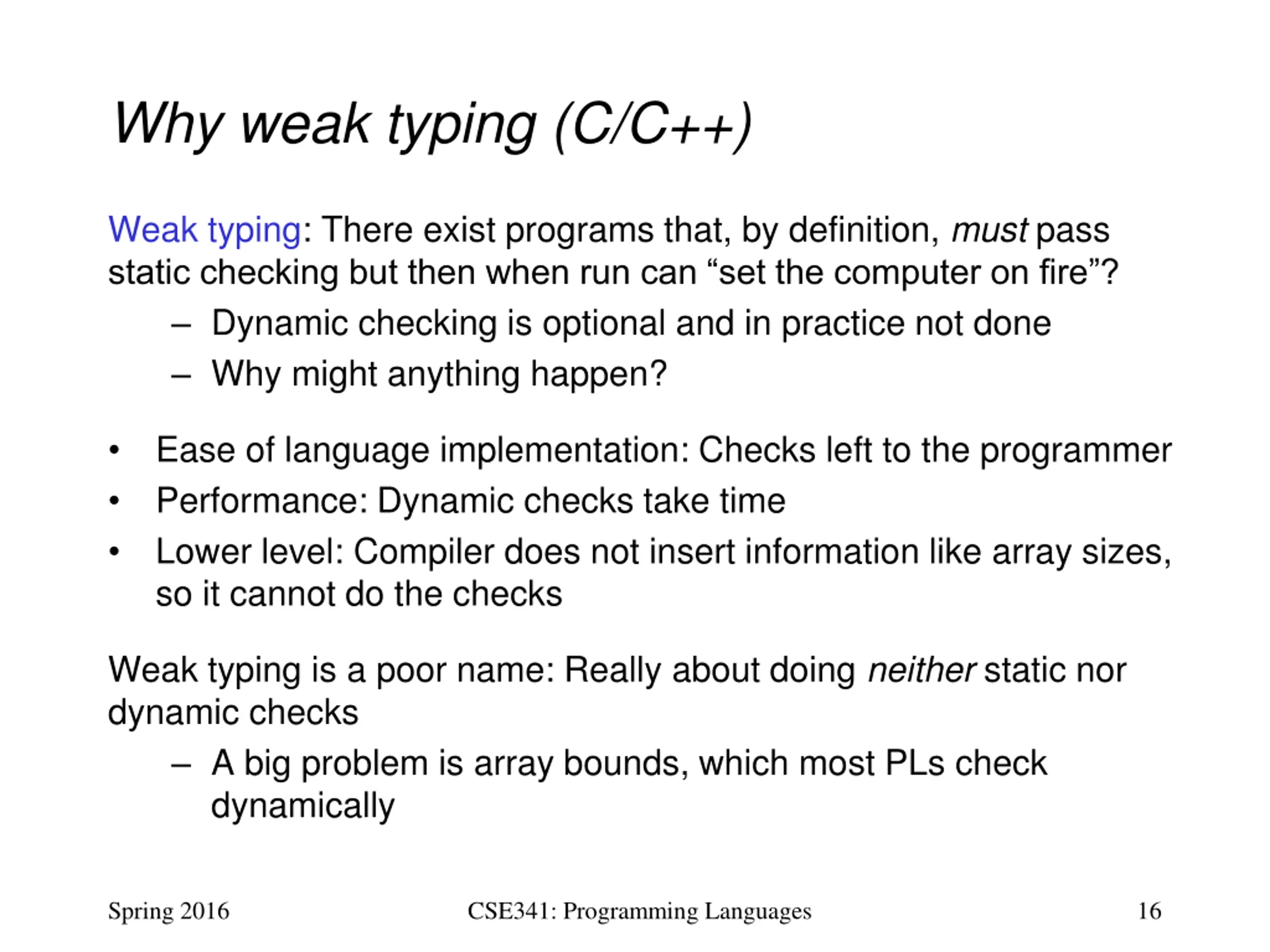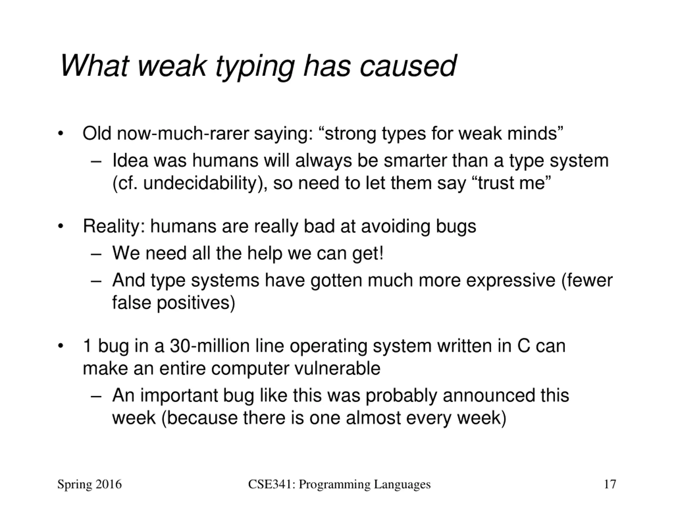 Why weak typing (C/C++) Weak typing: There exist programs that, by definition, must pass static checking but then when run can set the computer on fire ? Dynamic checking is optional and in practice not done Why might anything happen? Ease of language implementation: Checks left to the programmer Performance: Dynamic checks take time Lower level: Compiler does not insert information like array sizes, so it cannot do the checks Weak typing is a poor name: Really about doing neither static nor dynamic checks A big problem is array bounds, which most PLs check dynamically Spring 2016 CSE341: Programming Languages 16