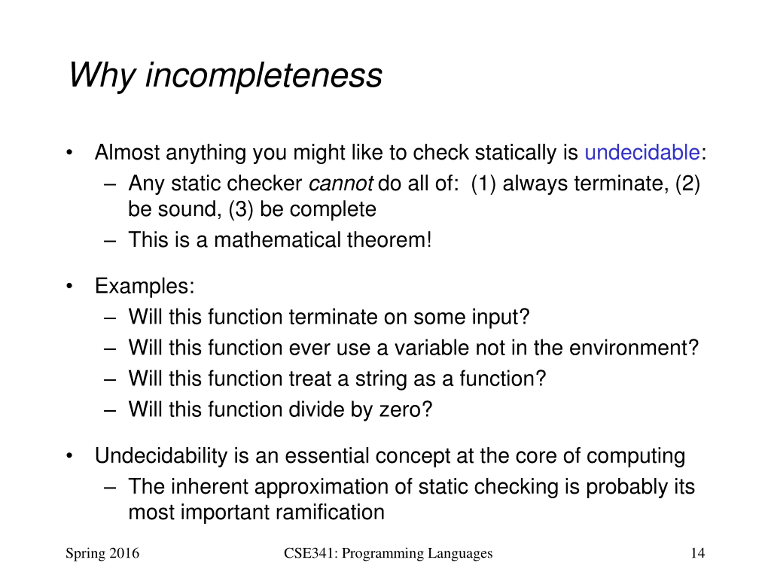 Why incompleteness Almost anything you might like to check statically is undecidable: Any static checker cannot do all of: (1) always terminate, (2) be sound, (3) be complete This is a mathematical theorem! Examples: Will this function terminate on some input? Will this function ever use a variable not in the environment? Will this function treat a string as a function? Will this function divide by zero? Undecidability is an essential concept at the core of computing The inherent approximation of static checking is probably its most important ramification Spring 2016 CSE341: Programming Languages 14
