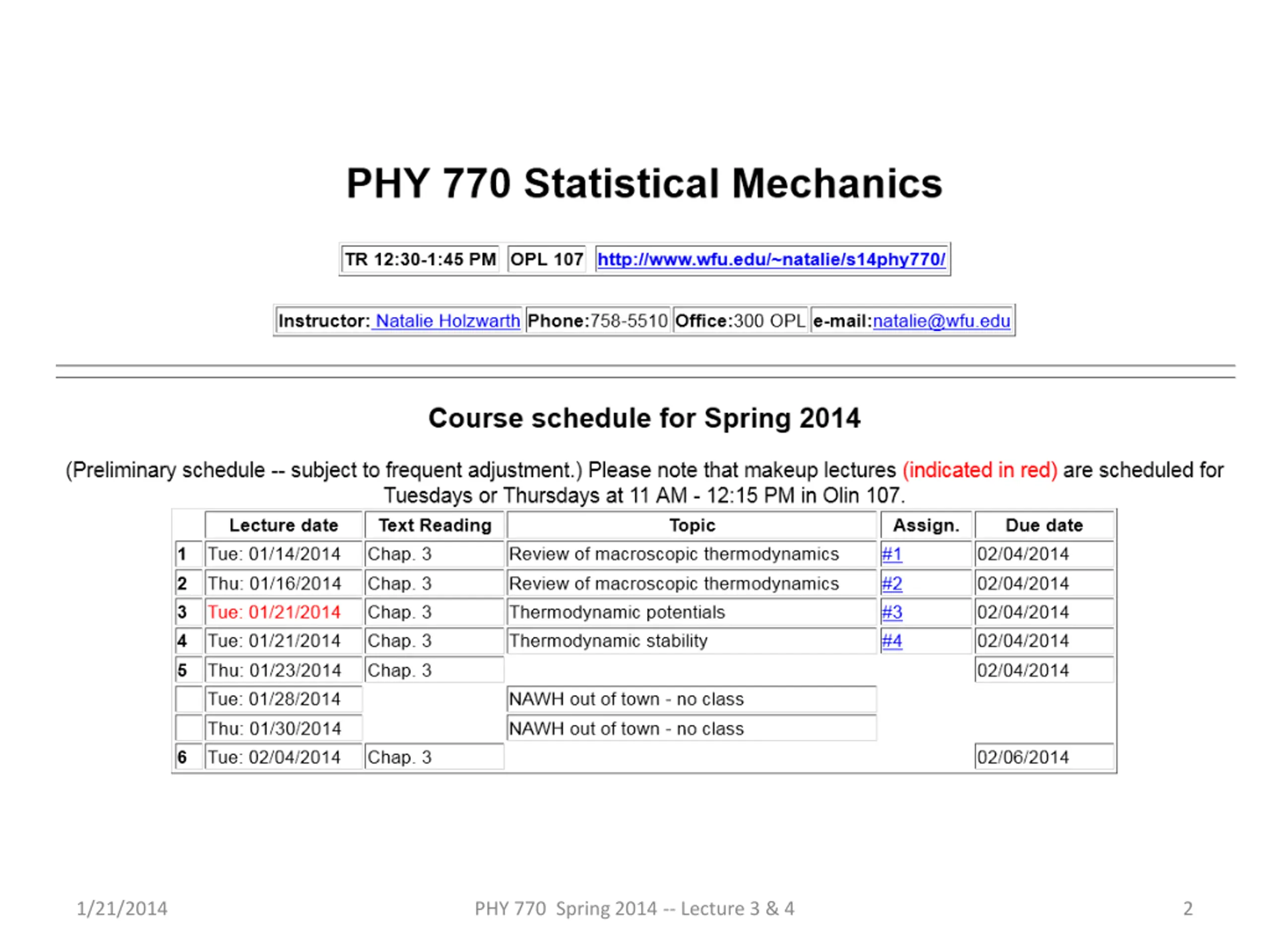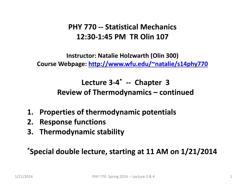 PHY 770 -- Statistical Mechanics 12:30-1:45 PM TR Olin 107 Instructor: Natalie Holzwarth (Olin 300) Course Webpage: http://www.wfu.edu/~natalie/s14phy770 Lecture 3-4* -- Chapter 3 Review of Thermodynamics continued 1. Properties of thermodynamic potentials 2. Response functions 3. Thermodynamic stability *Special double lecture, starting at 11 AM on 1/21/2014 1/21/2014 PHY 770 Spring 2014 -- Lecture 3 & 4 1