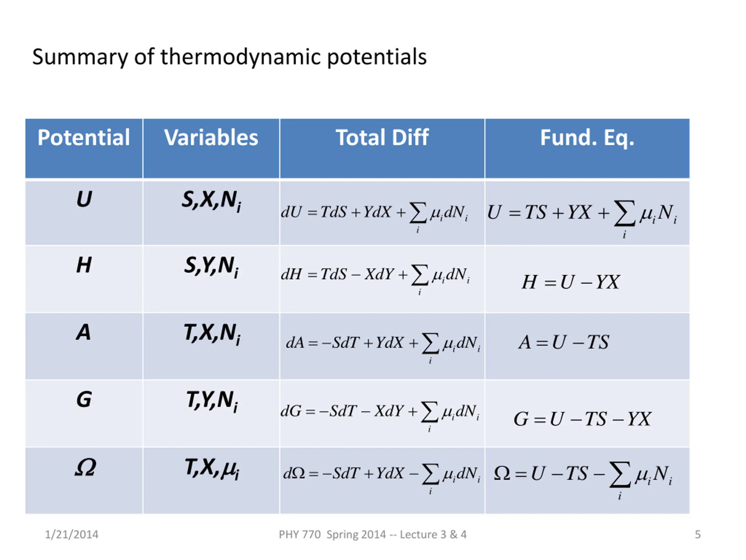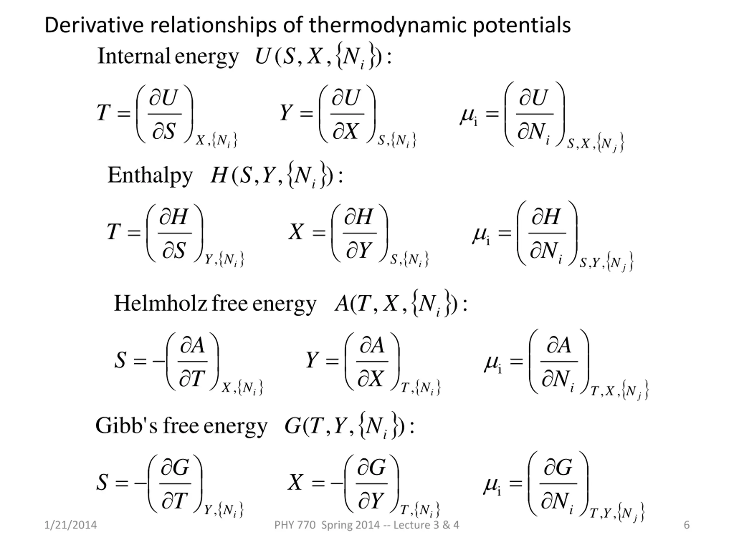 Summary of thermodynamic potentials Potential Variables Total Diff Fund. Eq. U S,X,Ni i i = + + U TS YX iN = + + idN dU TdS YdX i i H S,Y,Ni i = + idN dH TdS XdY = H U YX i A T,X,Ni i = A U TS = + + idN dA SdT YdX i G T,Y,Ni i = + idN dG SdT XdY = G U TS YX i T,X, i i i = U TS iN = + idN d SdT YdX i i 1/21/2014 PHY 770 Spring 2014 -- Lecture 3 & 4 5