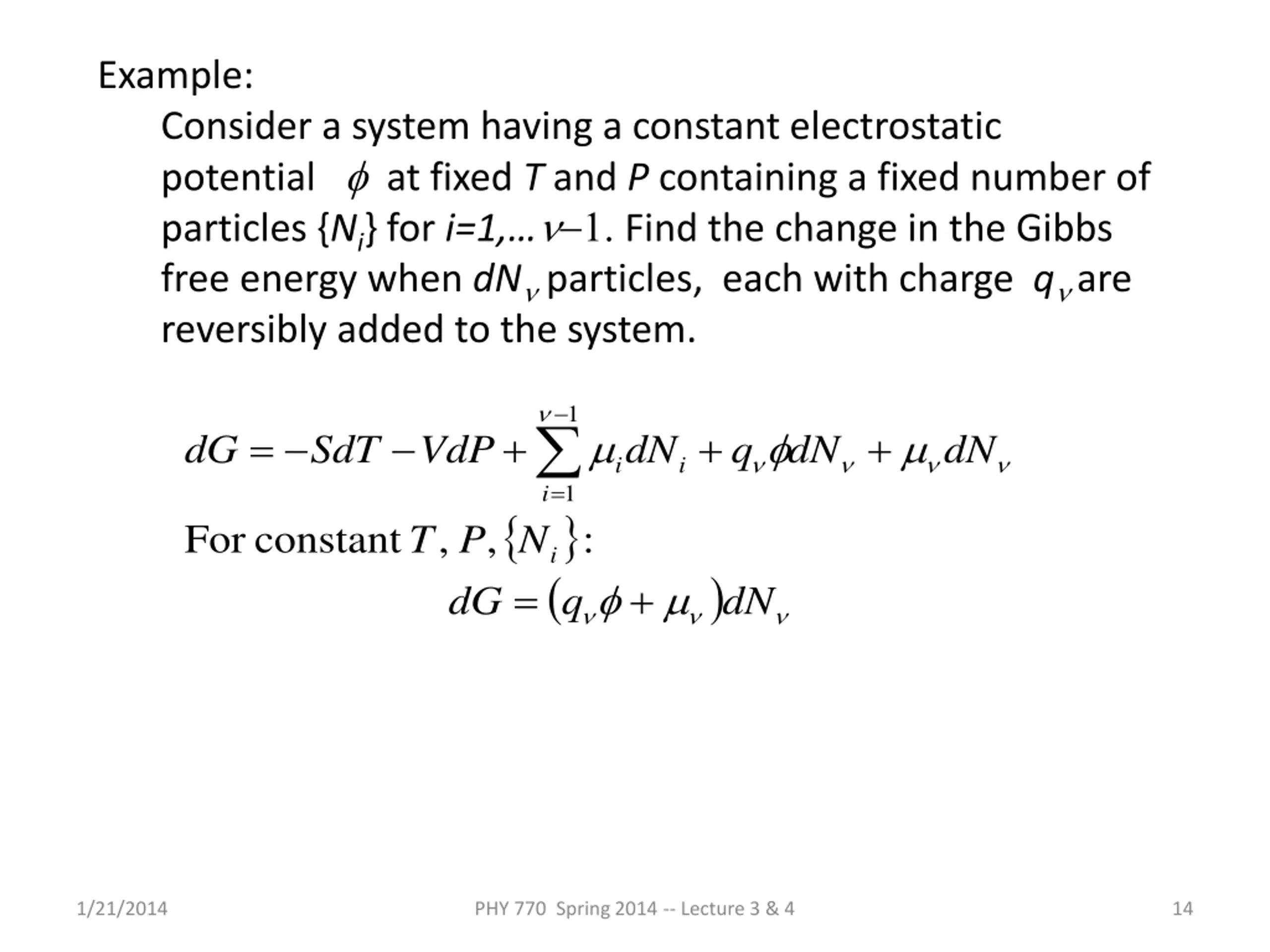 Example: Consider a system having a constant electrostatic potential at fixed T and P containing a fixed number of particles {Ni}fori=1, Find the change in the Gibbs free energy when dN particles, each with charge q are reversibly added to the system. = 1 = + + + dG SdT VdP dN q dN dN i i 1 i N = constant For , , : T P i ( ) + dG q dN 1/21/2014 PHY 770 Spring 2014 -- Lecture 3 & 4 14