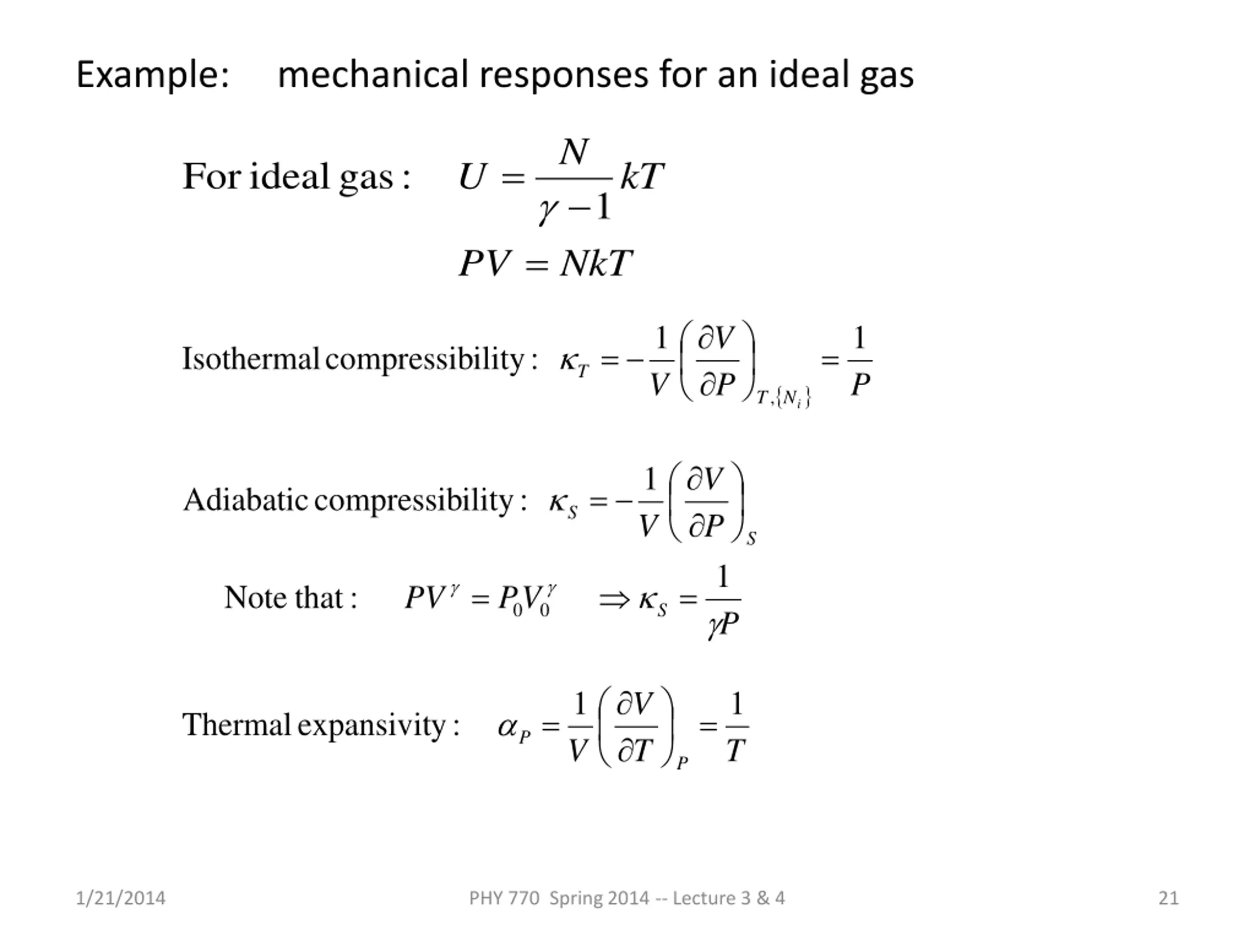 Example: mechanical responses for an ideal gas N = For ideal gas : U kT 1 = PV NkT 1 1 V = = Isothermal compressib ility : T V P P , T N i 1 V = Adiabatic compressib ility : S V P S 1 0 = = Note that : PV P V 0 S P 1 1 V = = Thermal expansivit y : P V T T P 1/21/2014 PHY 770 Spring 2014 -- Lecture 3 & 4 21
