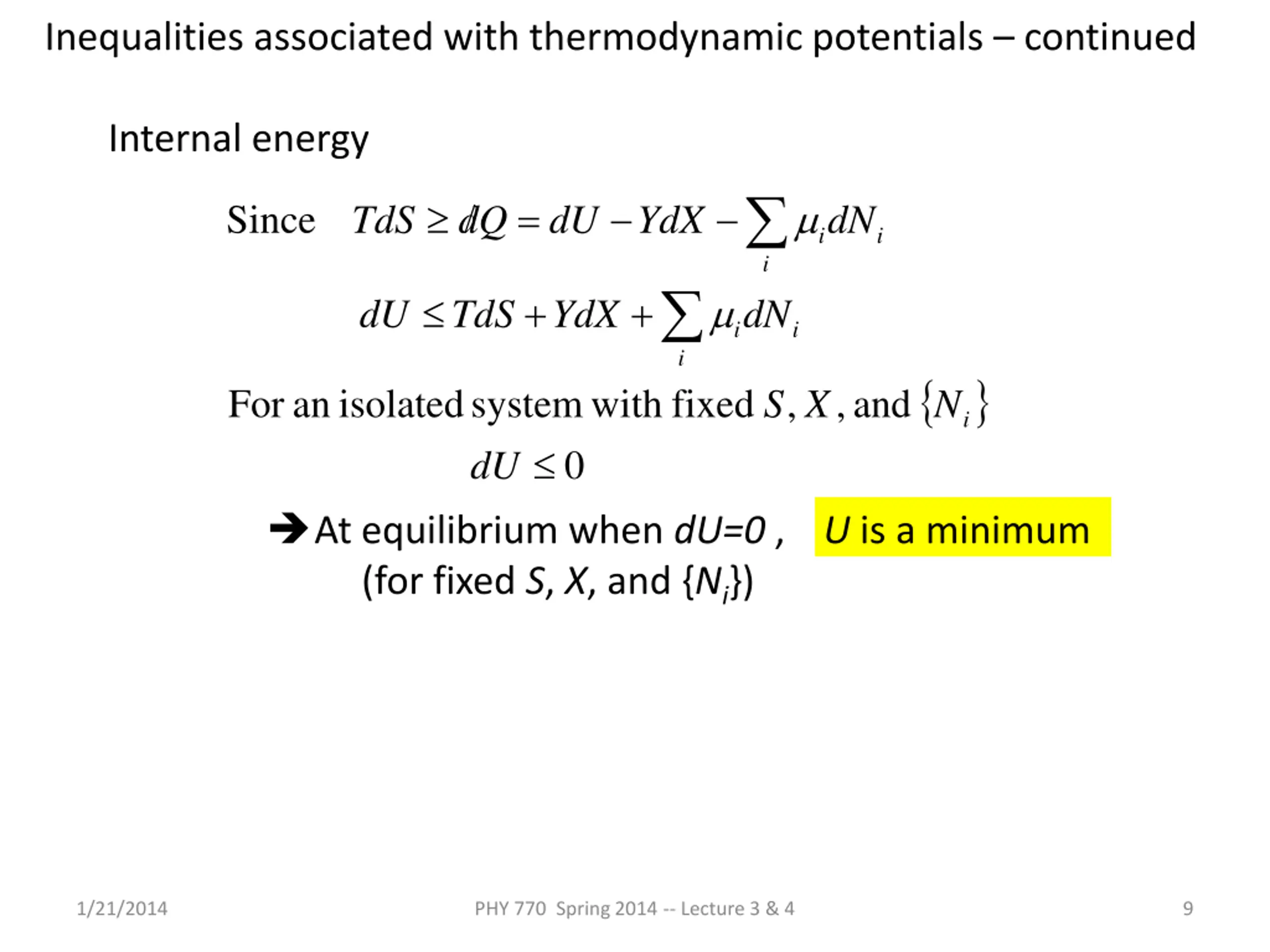 Inequalities associated with thermodynamic potentials continued Internal energy i = Since TdS d Q dU YdX dN i i i + + dU TdS YdX dN i i N isolated an For system dU with fixed , and , S X i At equilibrium when dU=0 , U is a minimum (for fixed S, X, and {Ni}) 0 1/21/2014 PHY 770 Spring 2014 -- Lecture 3 & 4 9