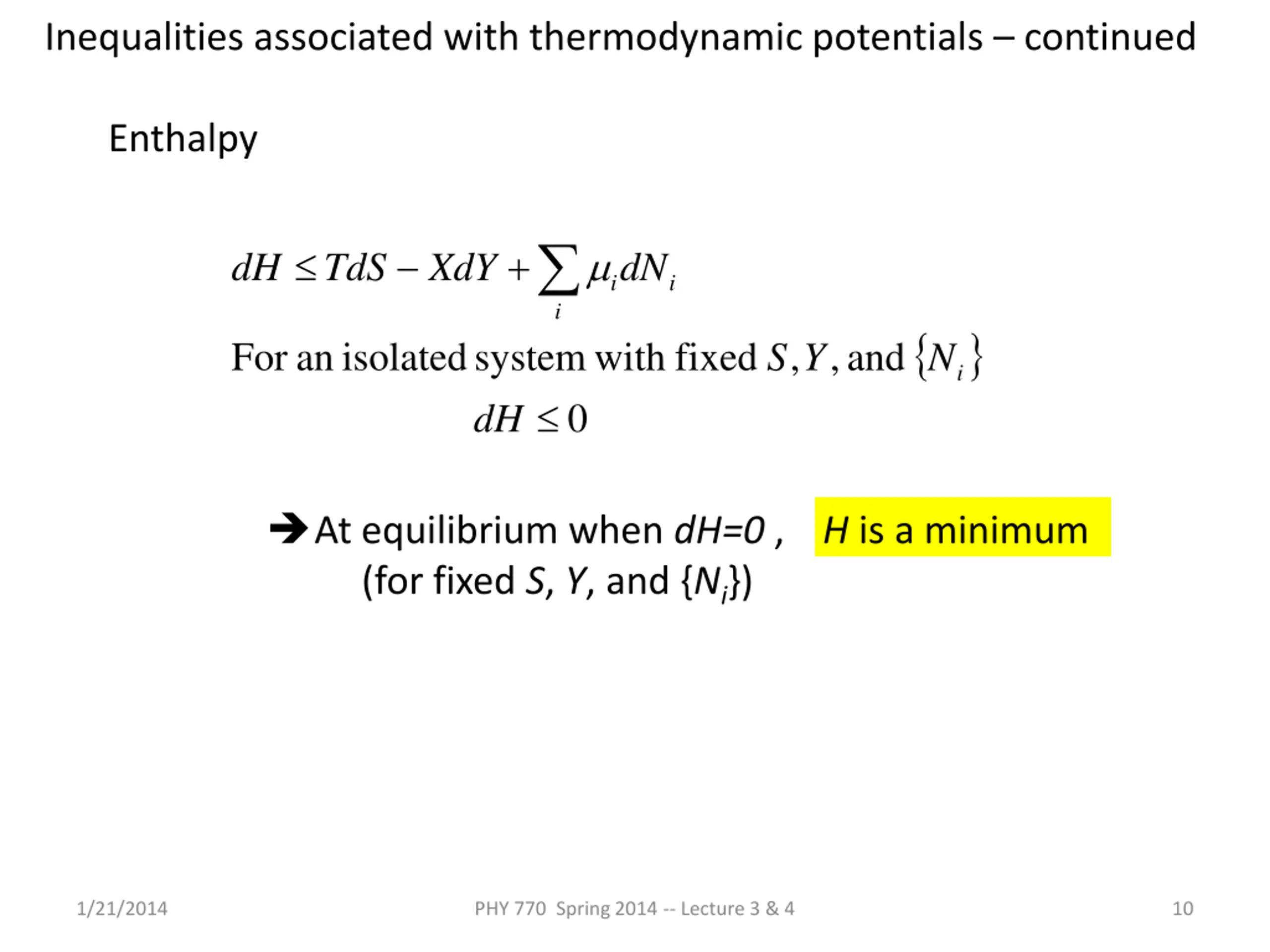 Inequalities associated with thermodynamic potentials continued Enthalpy i + i dH TdS XdY dN i N isolated an For system dH with fixed , and , S Y i 0 At equilibrium when dH=0 , H is a minimum (for fixed S, Y, and {Ni}) 1/21/2014 PHY 770 Spring 2014 -- Lecture 3 & 4 10