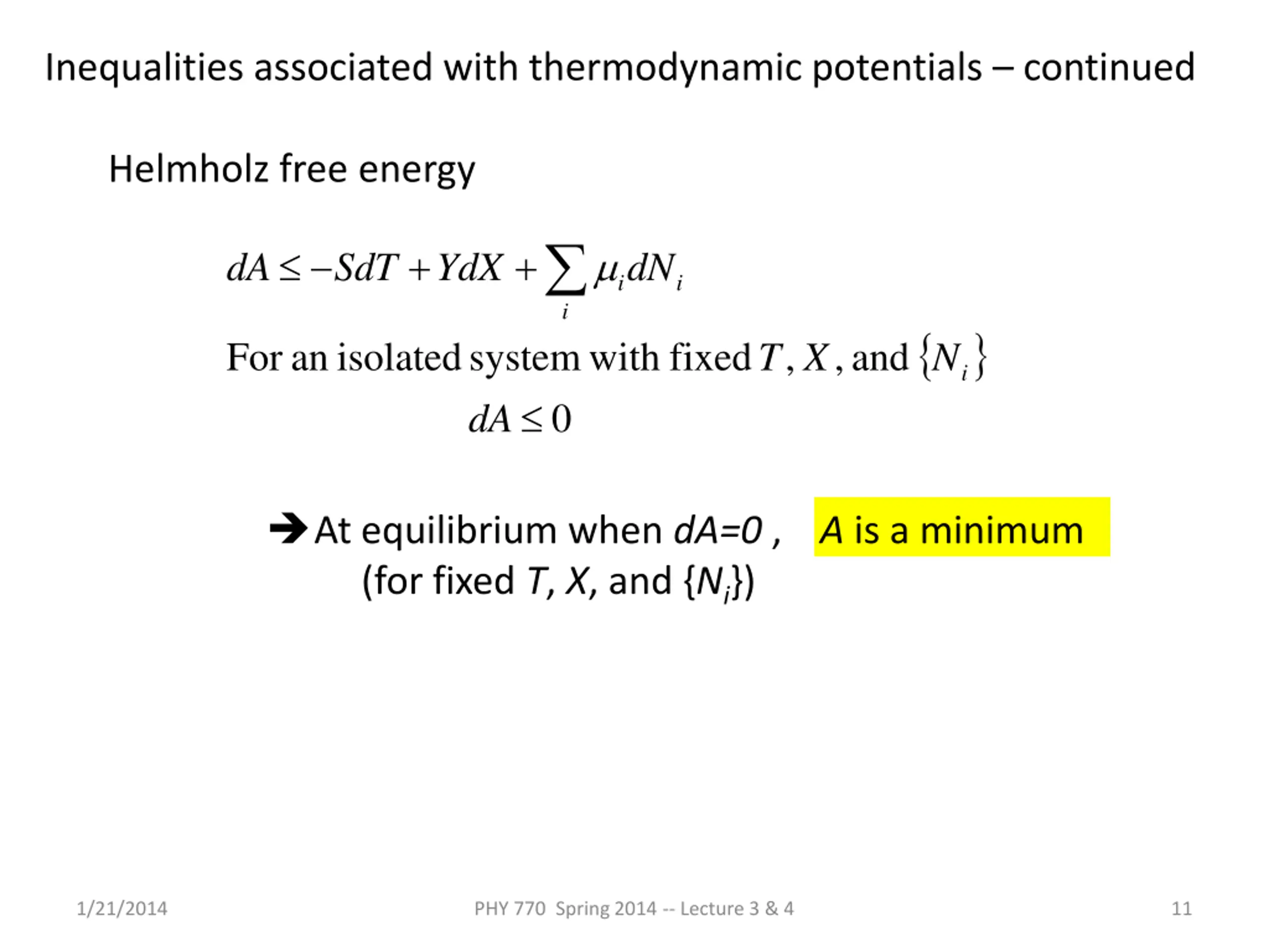 Inequalities associated with thermodynamic potentials continued Helmholz free energy i + + i dA SdT YdX dN i N isolated an For system dA with fixed , and , T X i 0 At equilibrium when dA=0 , A is a minimum (for fixed T, X, and {Ni}) 1/21/2014 PHY 770 Spring 2014 -- Lecture 3 & 4 11