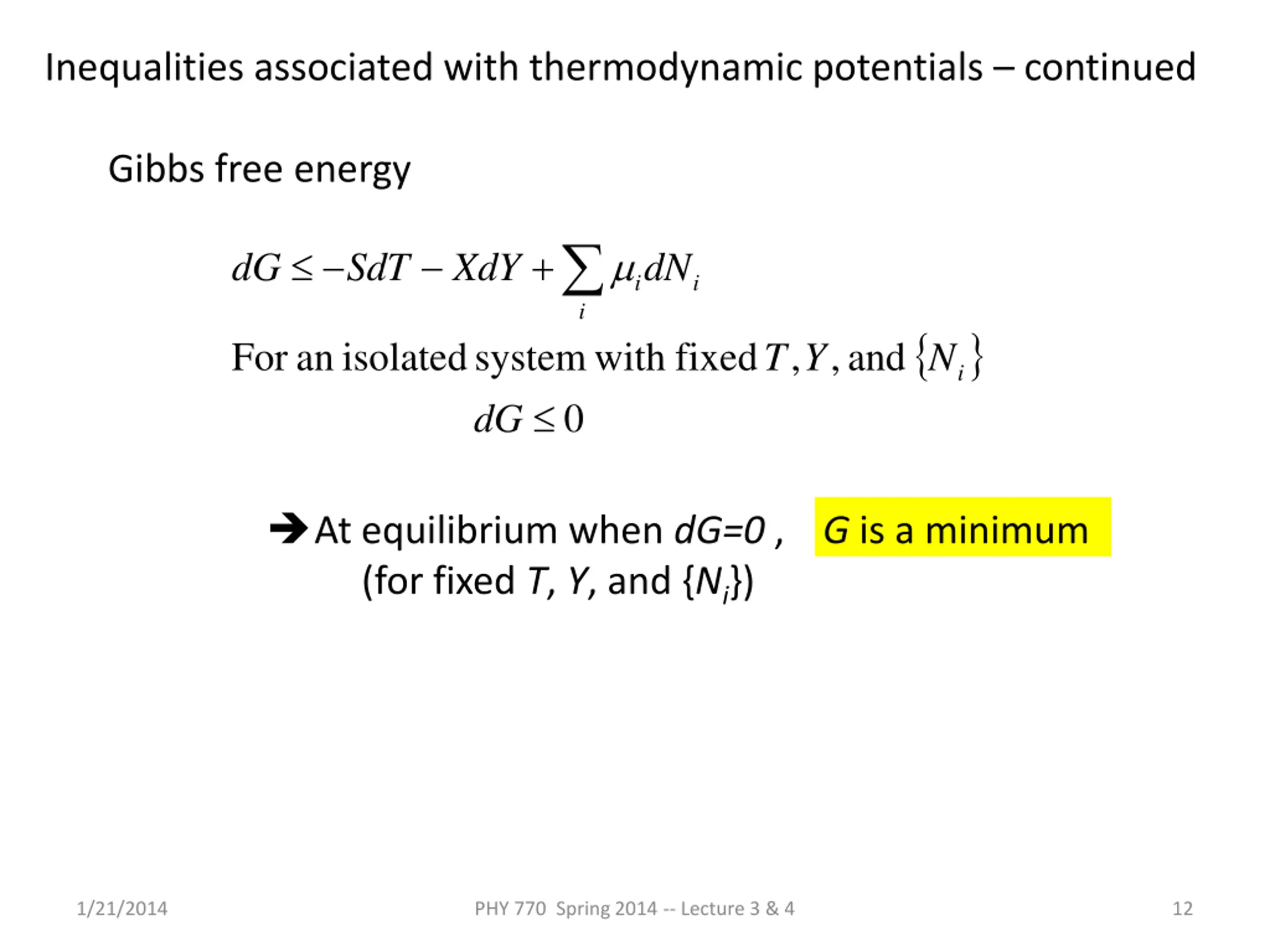 Inequalities associated with thermodynamic potentials continued Gibbs free energy i + i dG SdT XdY dN i N isolated an For system dG with fixed , and , T Y i 0 At equilibrium when dG=0 , G is a minimum (for fixed T, Y, and {Ni}) 1/21/2014 PHY 770 Spring 2014 -- Lecture 3 & 4 12