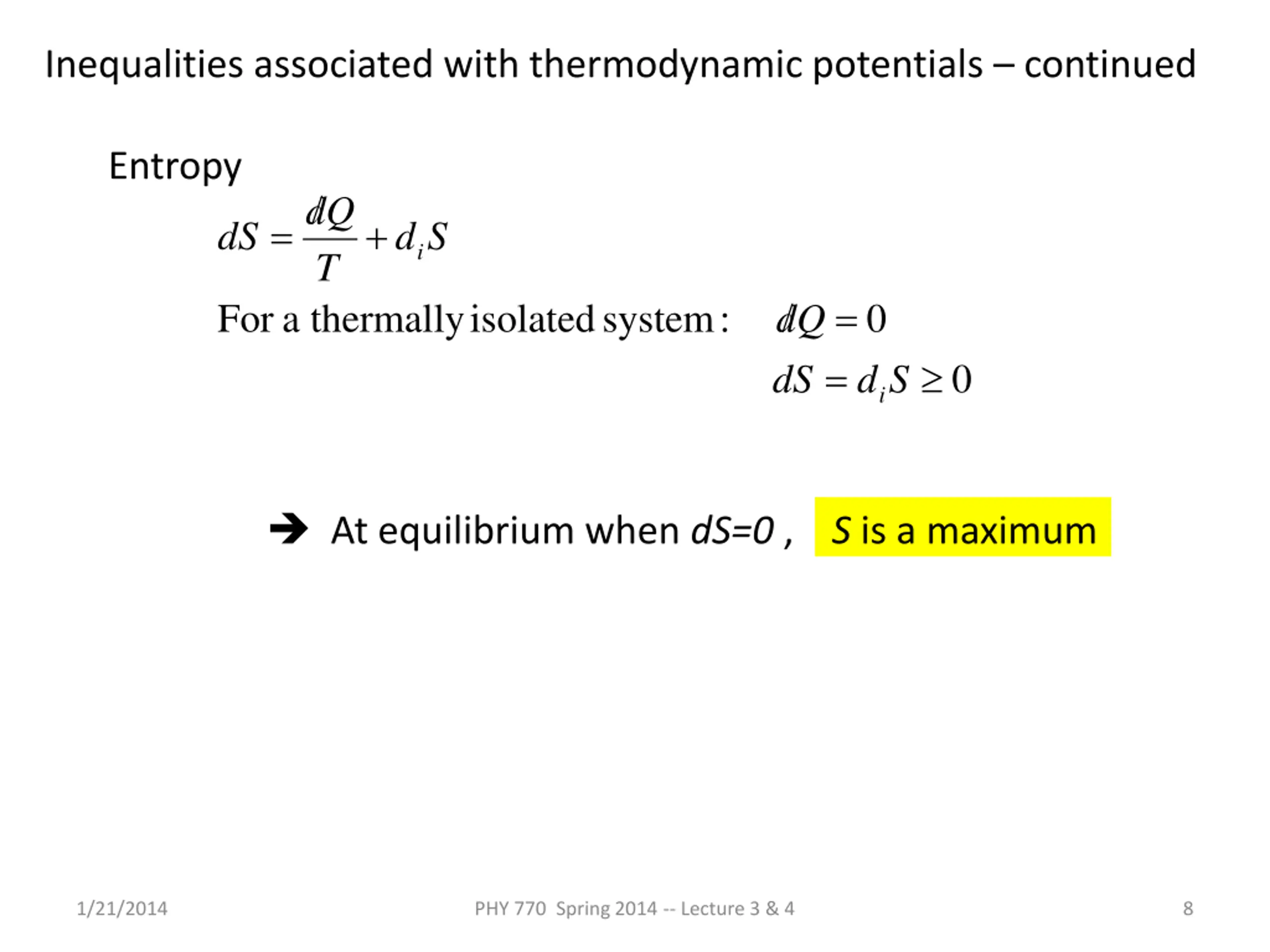 Inequalities associated with thermodynamic potentials continued Entropy T d Q = + dS d S i = For a thermally isolated system : 0 d d Q = 0 dS S i At equilibrium when dS=0 , S is a maximum 1/21/2014 PHY 770 Spring 2014 -- Lecture 3 & 4 8