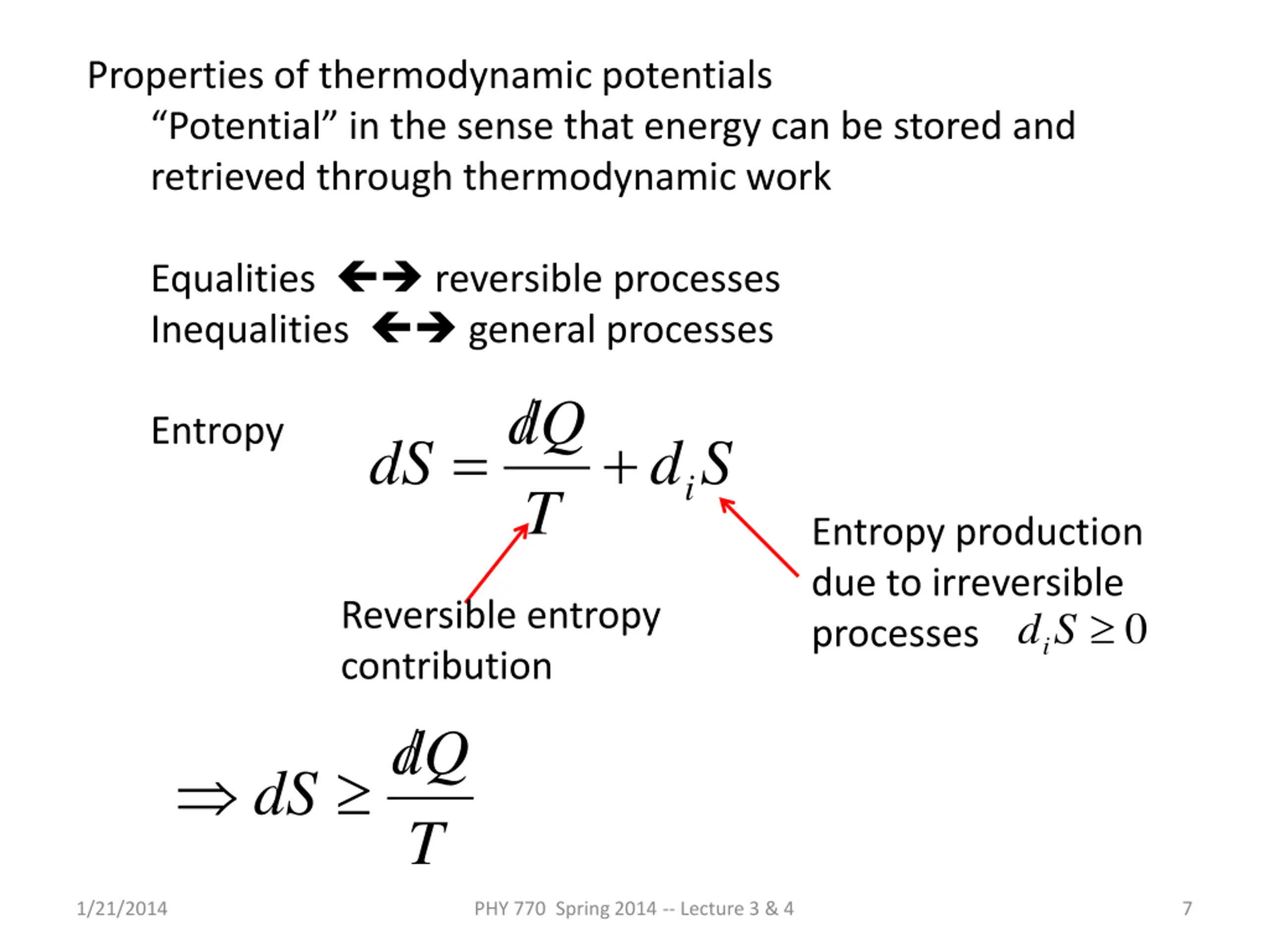 Properties of thermodynamic potentials Potential in the sense that energy can be stored and retrieved through thermodynamic work Equalities reversible processes Inequalities general processes d Q Entropy = + dS d S i T Entropy production due to irreversible processes Reversible entropy contribution Q d 0 di S dS T 1/21/2014 PHY 770 Spring 2014 -- Lecture 3 & 4 7