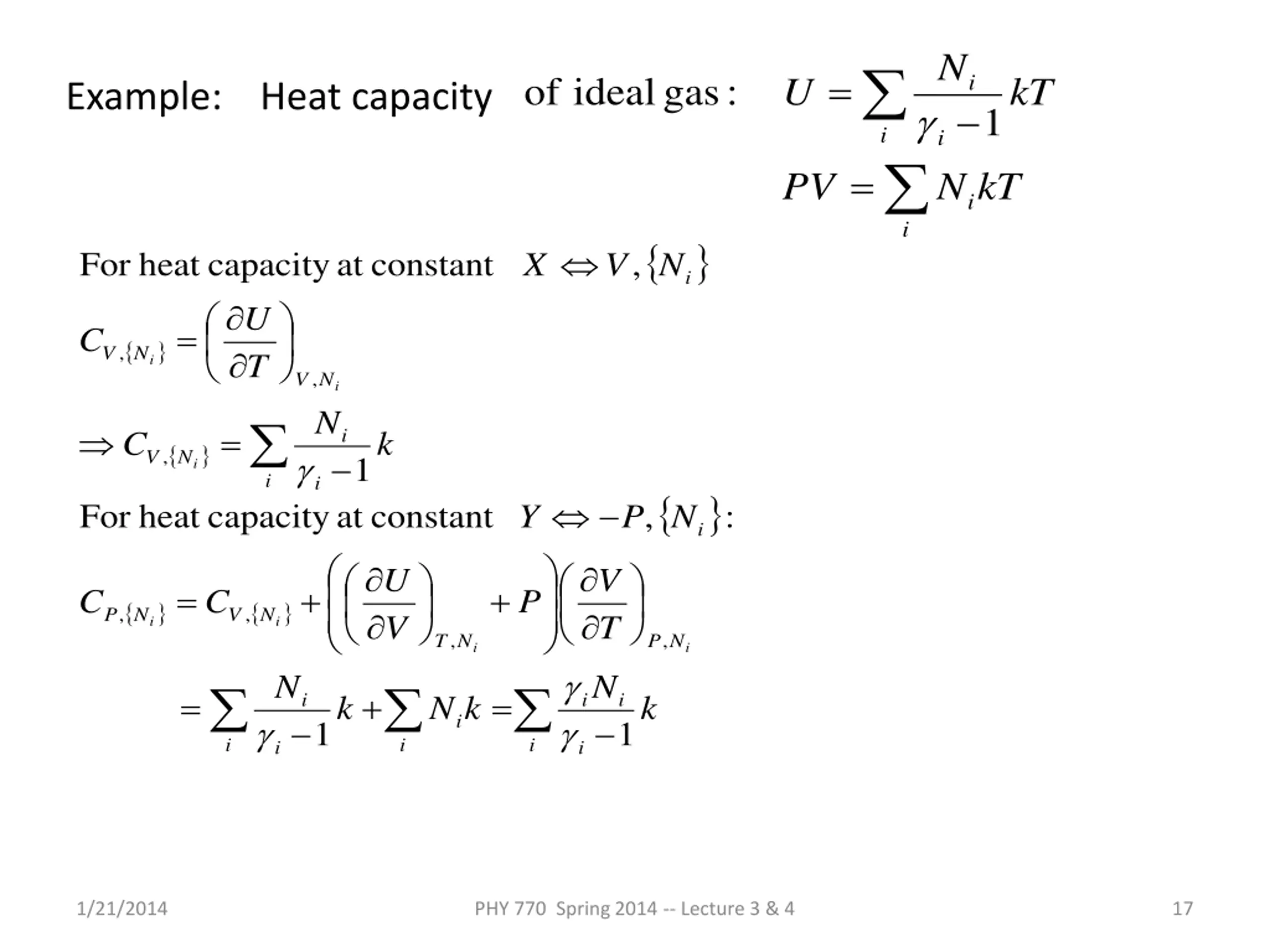 N i = of ideal gas : i U kT Example: Heat capacity 1 i N i = PV kT i N For heat capacity constant at , X V i U = C , V N T i , V N N i = i C k , V N at 1 i i i N For heat capacity constant Y , : P i U V = + + C C P , , P N V N V T i i , , T N P N i i N N i i i = + = i i i 1 k N k k i 1 i i 1/21/2014 PHY 770 Spring 2014 -- Lecture 3 & 4 17