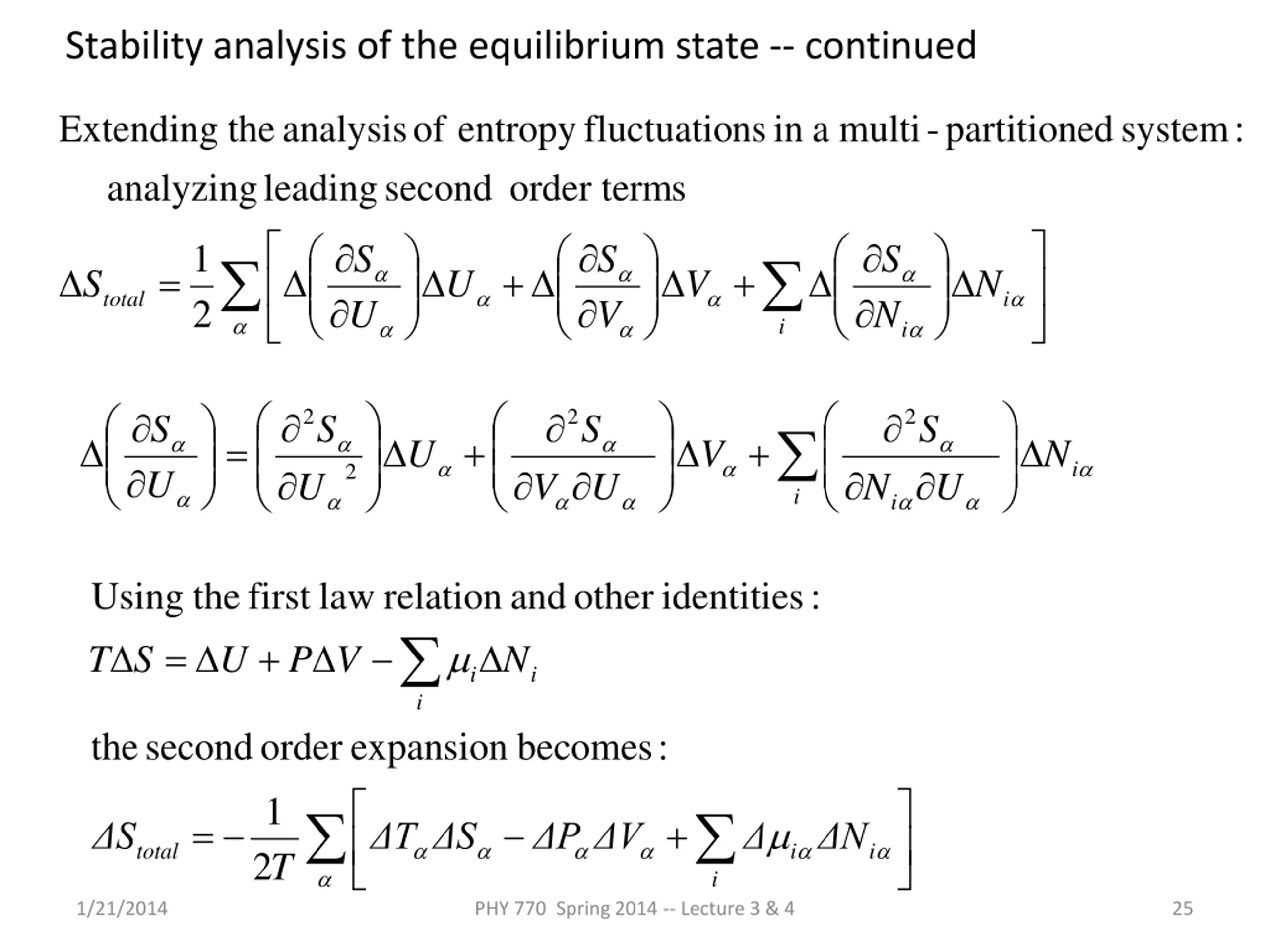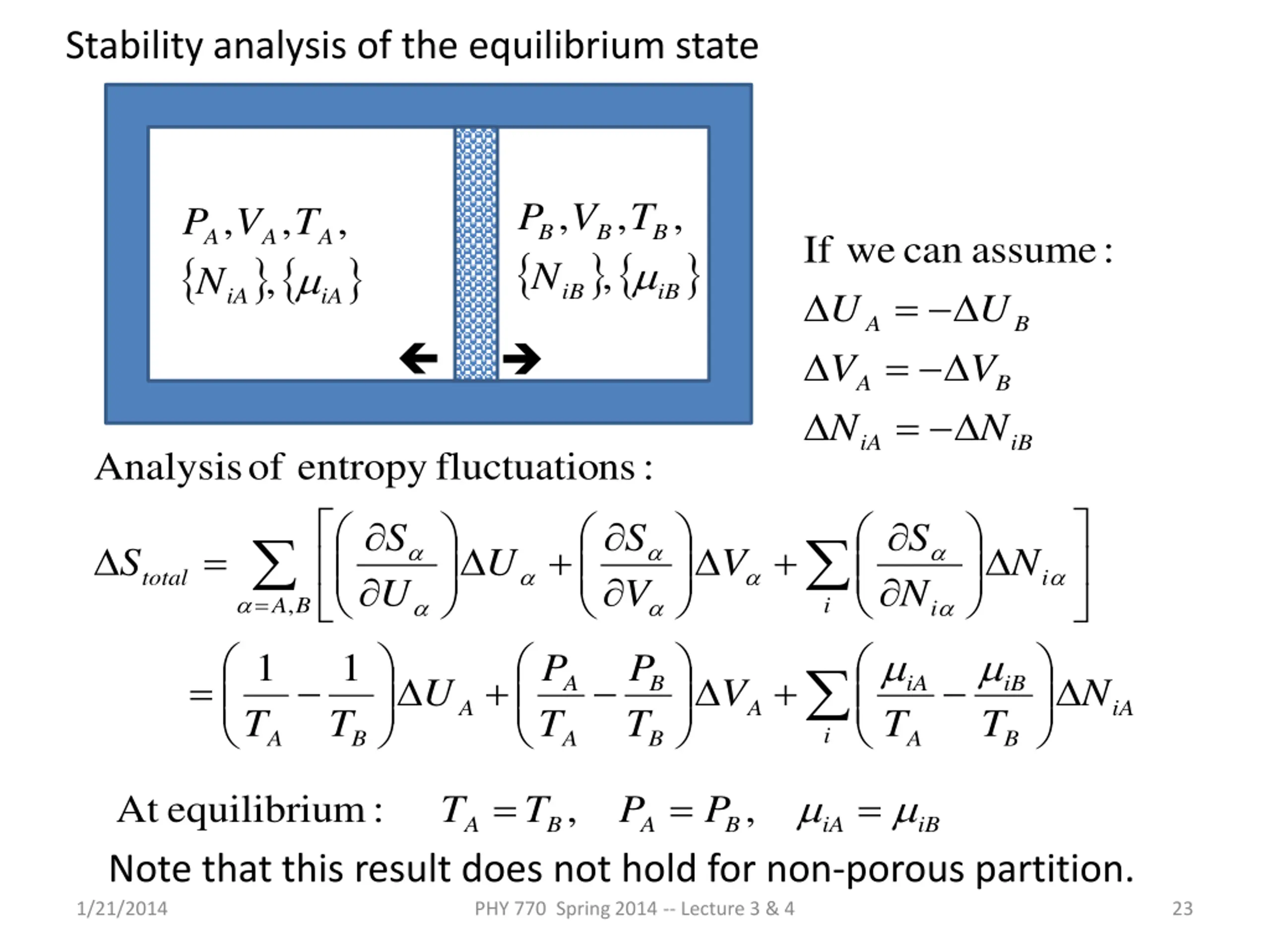 Stability analysis of the equilibrium state , , , P V T , , , P V T B N B B A A A If we can assume : , , N iB iB = iA iA U U A B = V V A B = N N iA iB Analysis of entropy fluctuatio ns : S S S = A i 1 = + + S U V N total i U V N , B i 1 P P i = + + iA iB A B U V N A A iA T T T T T T A B A B A B = = = equilibriu At Note that this result does not hold for non-porous partition. m : , , T T P P A B A B iA iB 1/21/2014 PHY 770 Spring 2014 -- Lecture 3 & 4 23