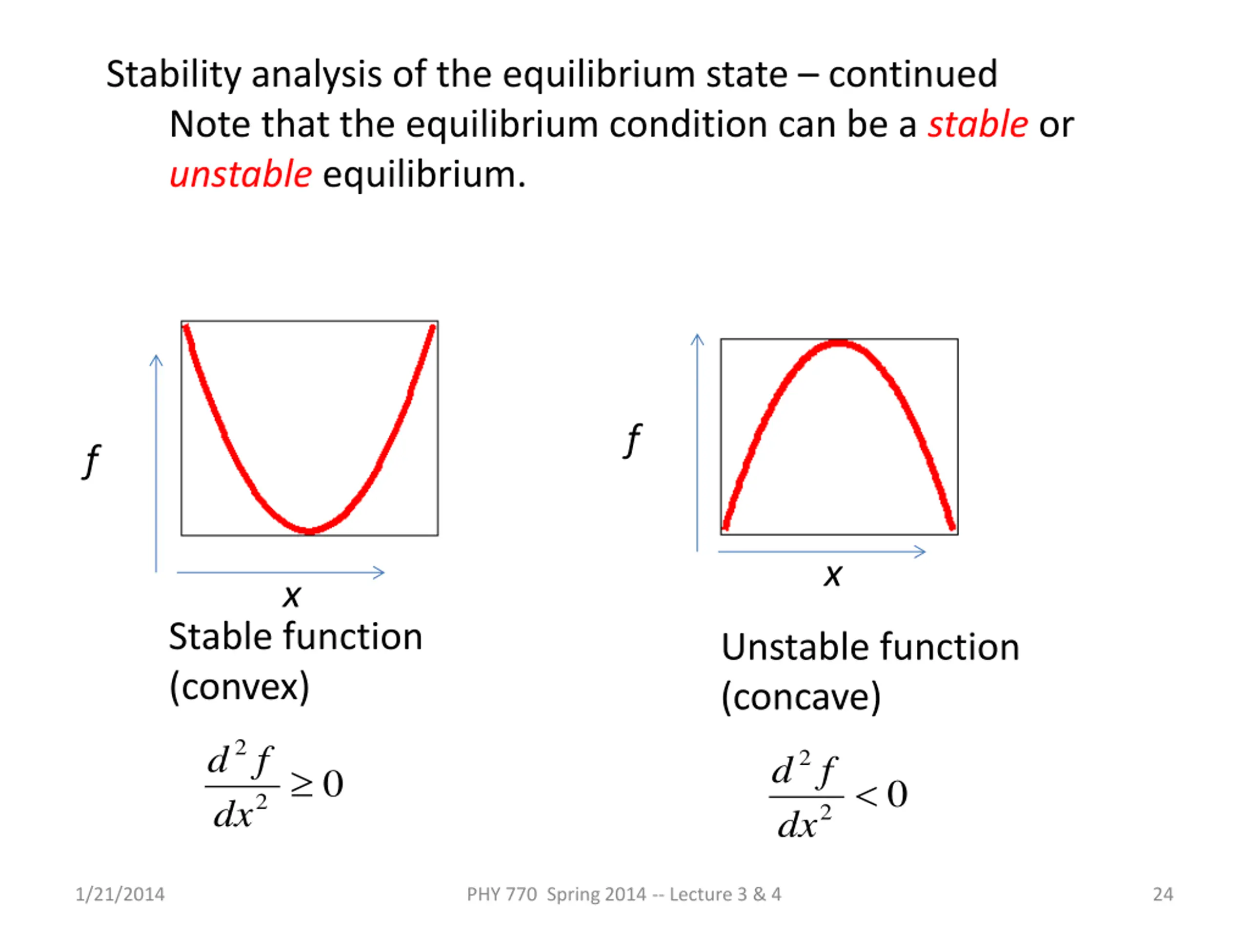 Stability analysis of the equilibrium state continued Note that the equilibrium condition can be a stable or unstable equilibrium. f f x x Stable function (convex) Unstable function (concave) 2 d f 2 d f 0 0 2 dx 2 dx 1/21/2014 PHY 770 Spring 2014 -- Lecture 3 & 4 24