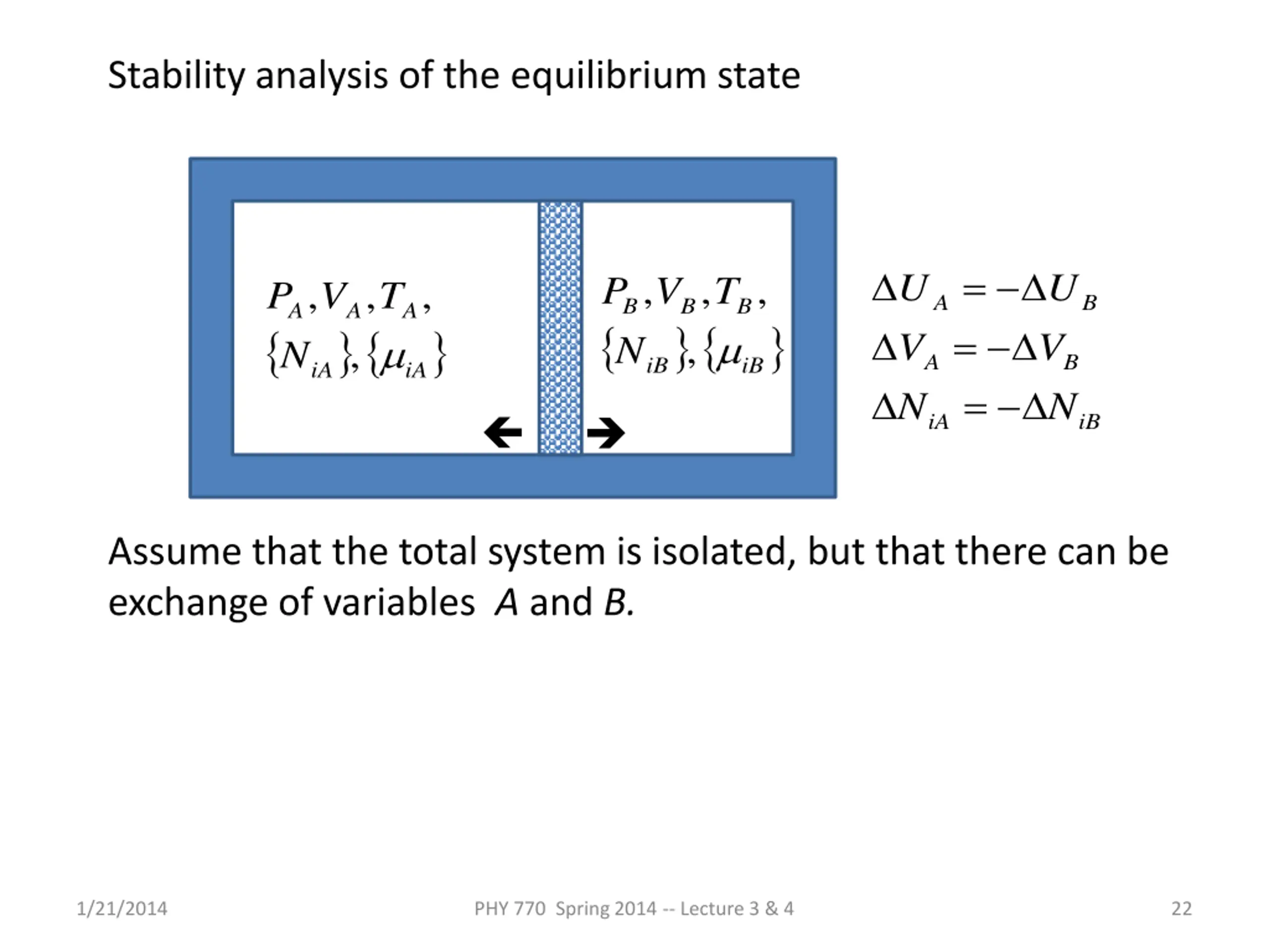 Stability analysis of the equilibrium state = U U , , , P V T , , , P V T A B B N B B A A A , , = V V N A B iB iB iA iA = N N iA iB Assume that the total system is isolated, but that there can be exchange of variables A and B. 1/21/2014 PHY 770 Spring 2014 -- Lecture 3 & 4 22