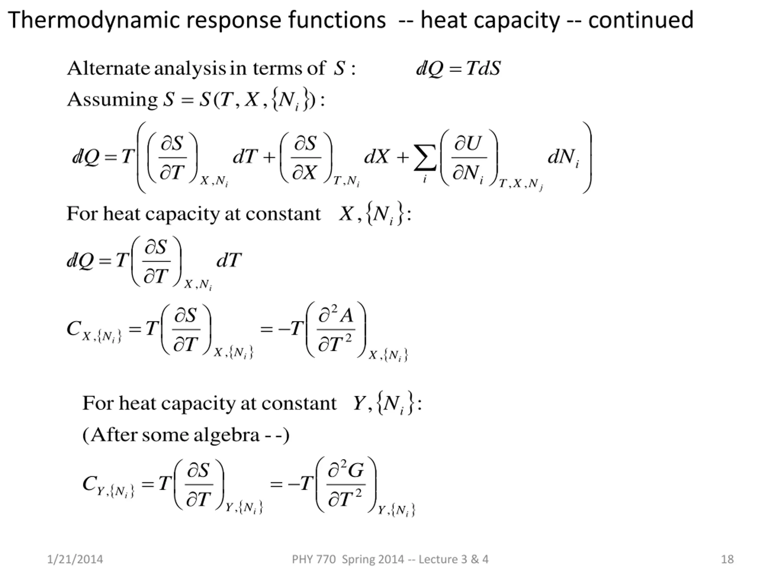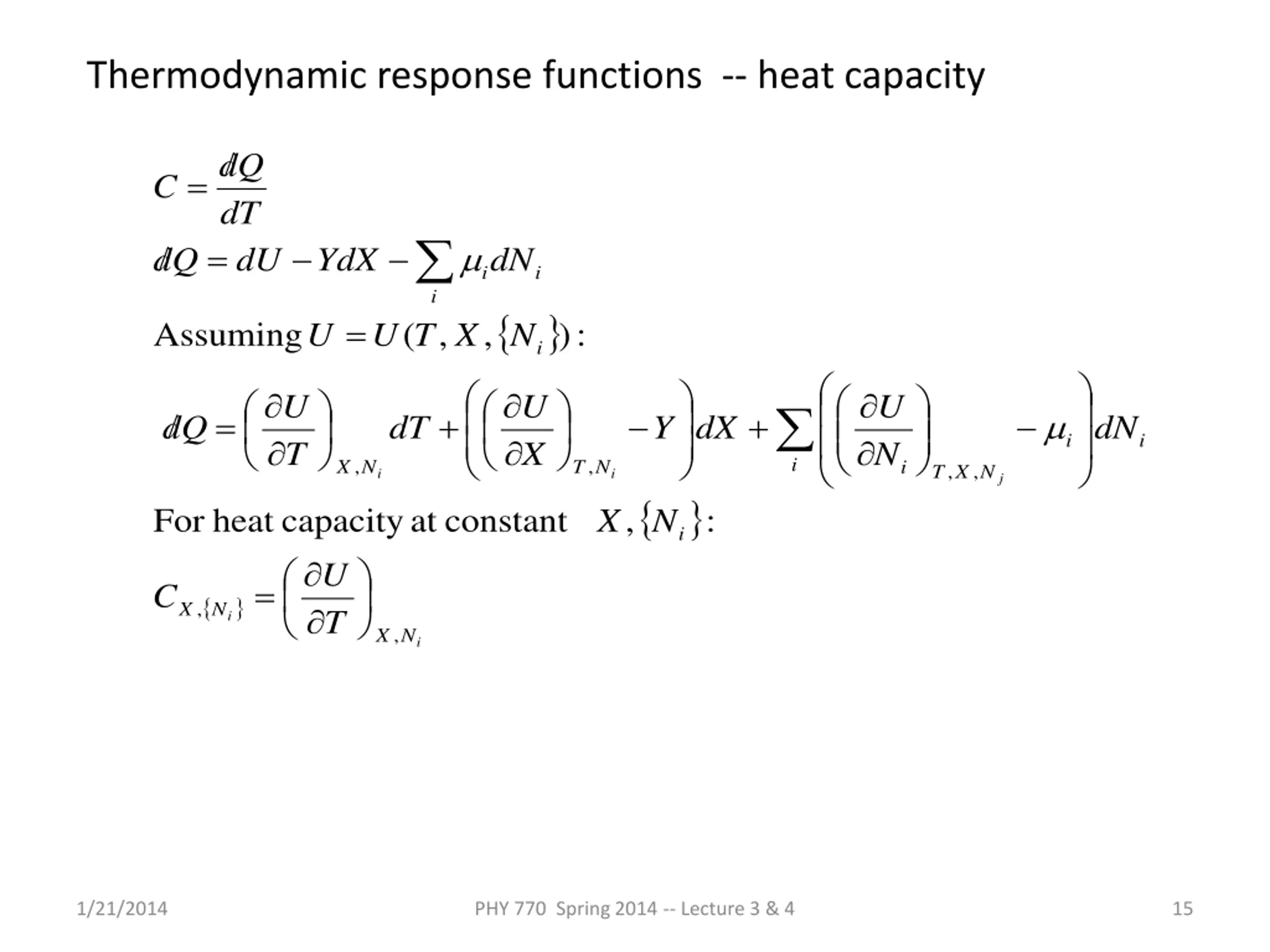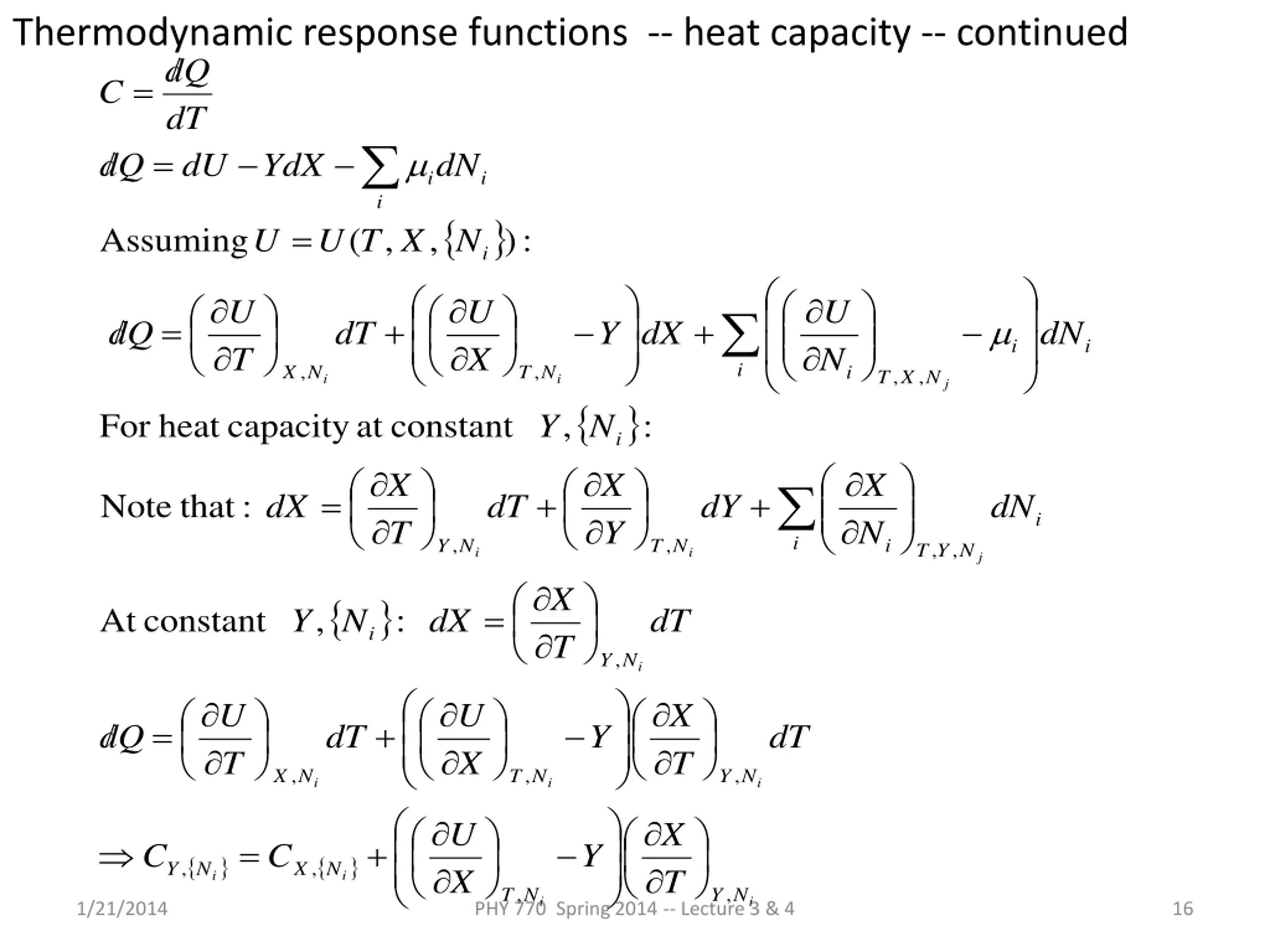 Thermodynamic response functions -- heat capacity d Q = C dT = d Q dU YdX dN i i i N = Assuming U ( , , : ) U T X i U U U = + + d Q dT Y dX dN i i T X N i , , X N T N i , , T X N i i j N For heat capacity constant at , : X i U = C , X N T i , X N i 1/21/2014 PHY 770 Spring 2014 -- Lecture 3 & 4 15