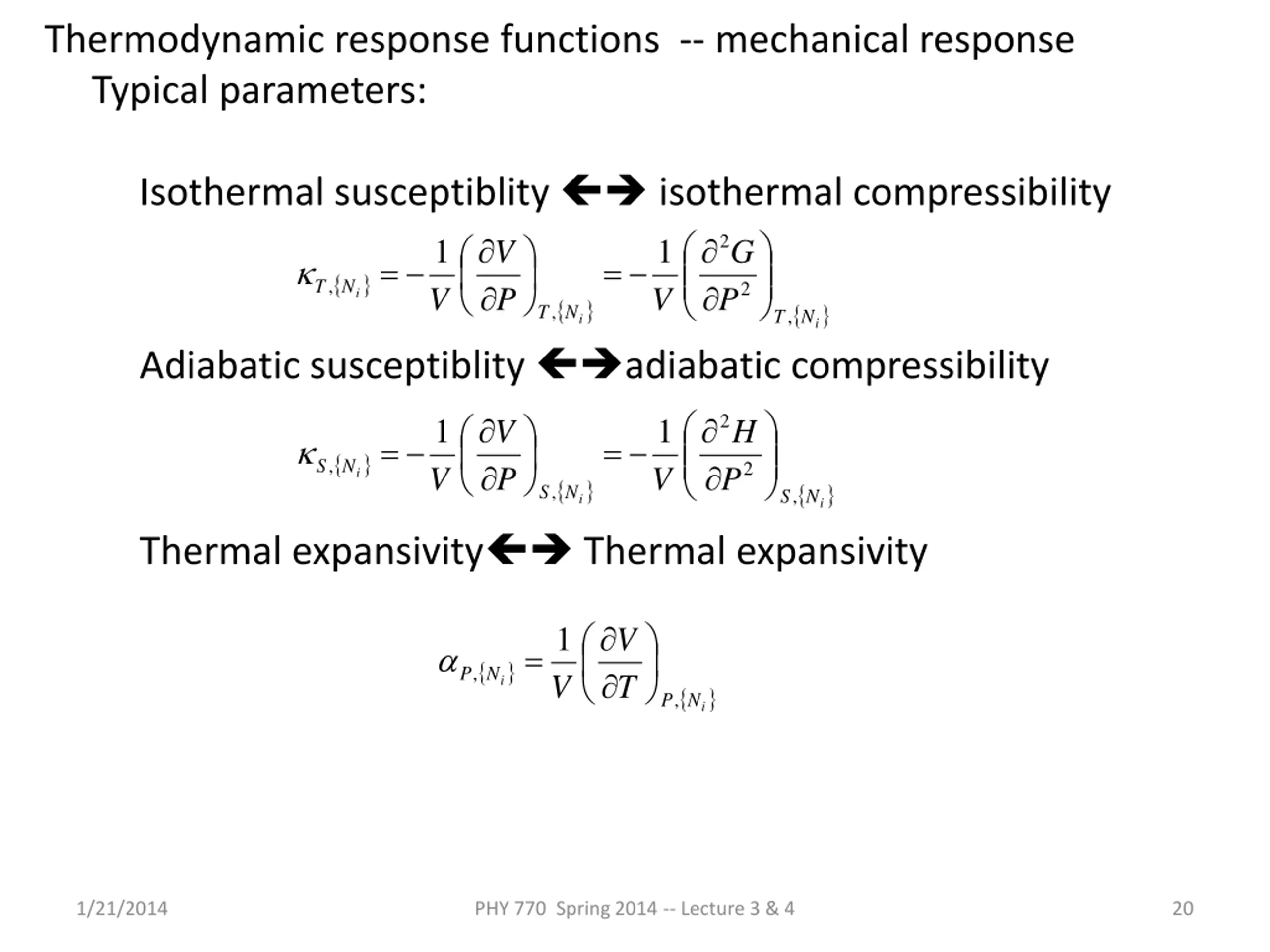 Thermodynamic response functions -- mechanical response Typical parameters: Isothermal susceptiblity isothermal compressibility V V , Adiabatic susceptiblity adiabatic compressibility 2 1 1 G 2 = = , T N P V P i T N , T N i i 2 1 1 V H 2 = = , S N V P V P i , S N , S N i i Thermal expansivity Thermal expansivity 1 V = , P N V T i , P N i 1/21/2014 PHY 770 Spring 2014 -- Lecture 3 & 4 20