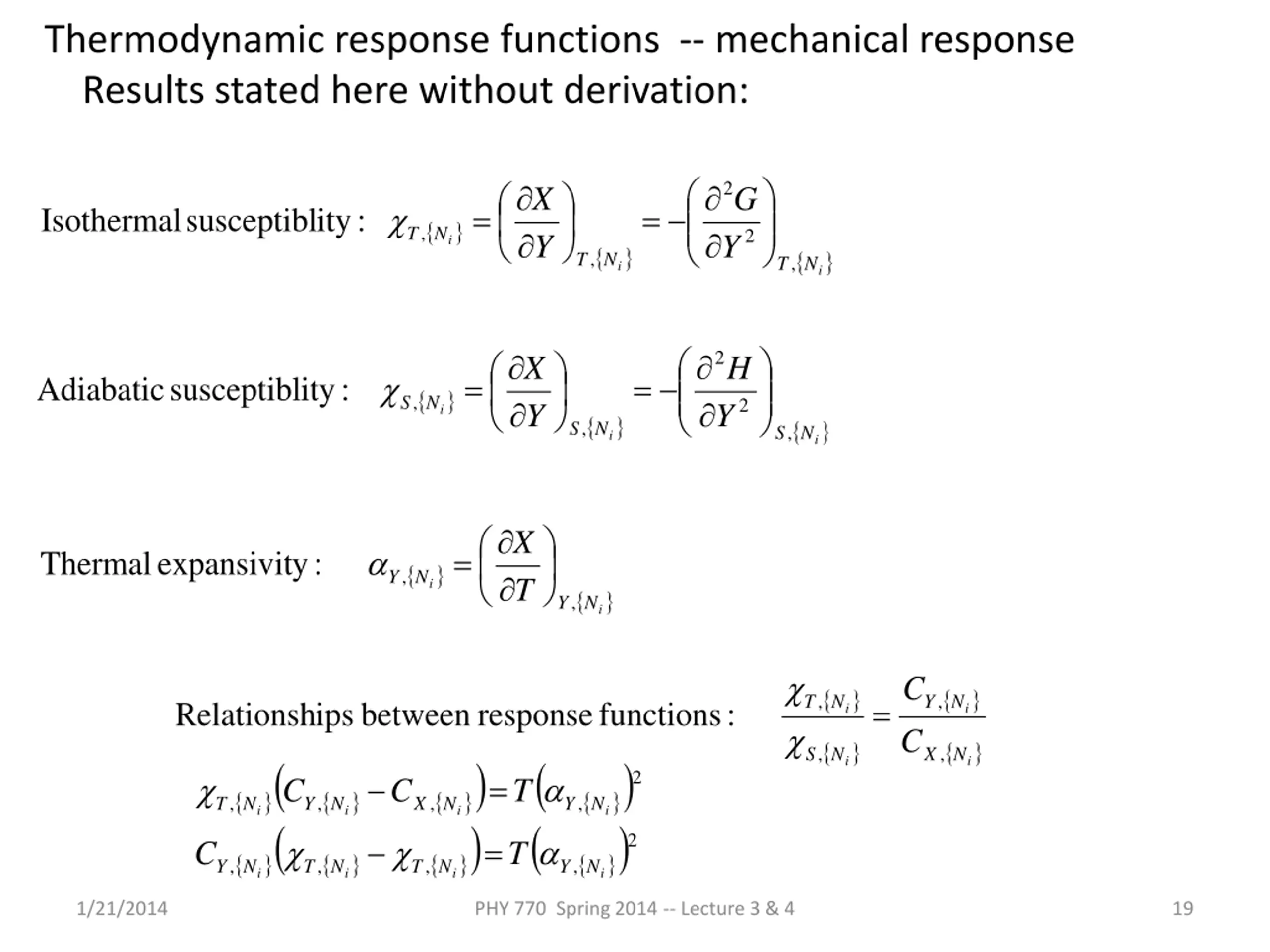 Thermodynamic response functions -- mechanical response Results stated here without derivation: 2 X G 2 = = Isothermal susceptibl ity : , T N Y Y i , T N , T N i i 2 X H = = Adiabatic susceptibl ity : , S N 2 Y Y i , S N , S N i i X = Thermal expansivit y : , Y N T i , Y N i C , , T N Y N = Relationsh between ips response ) ) T = functions ) )2 i N : i i C , , S N X N ( ( ( ( i i 2 = C C T , , , , T N Y N X N Y N i i i i C , , , , Y N T N T N Y i i i 1/21/2014 PHY 770 Spring 2014 -- Lecture 3 & 4 19