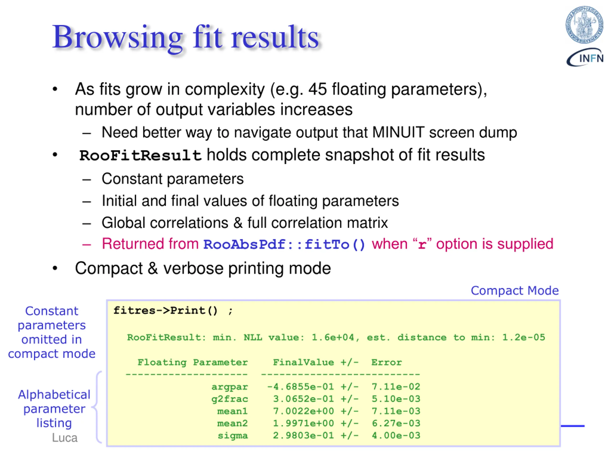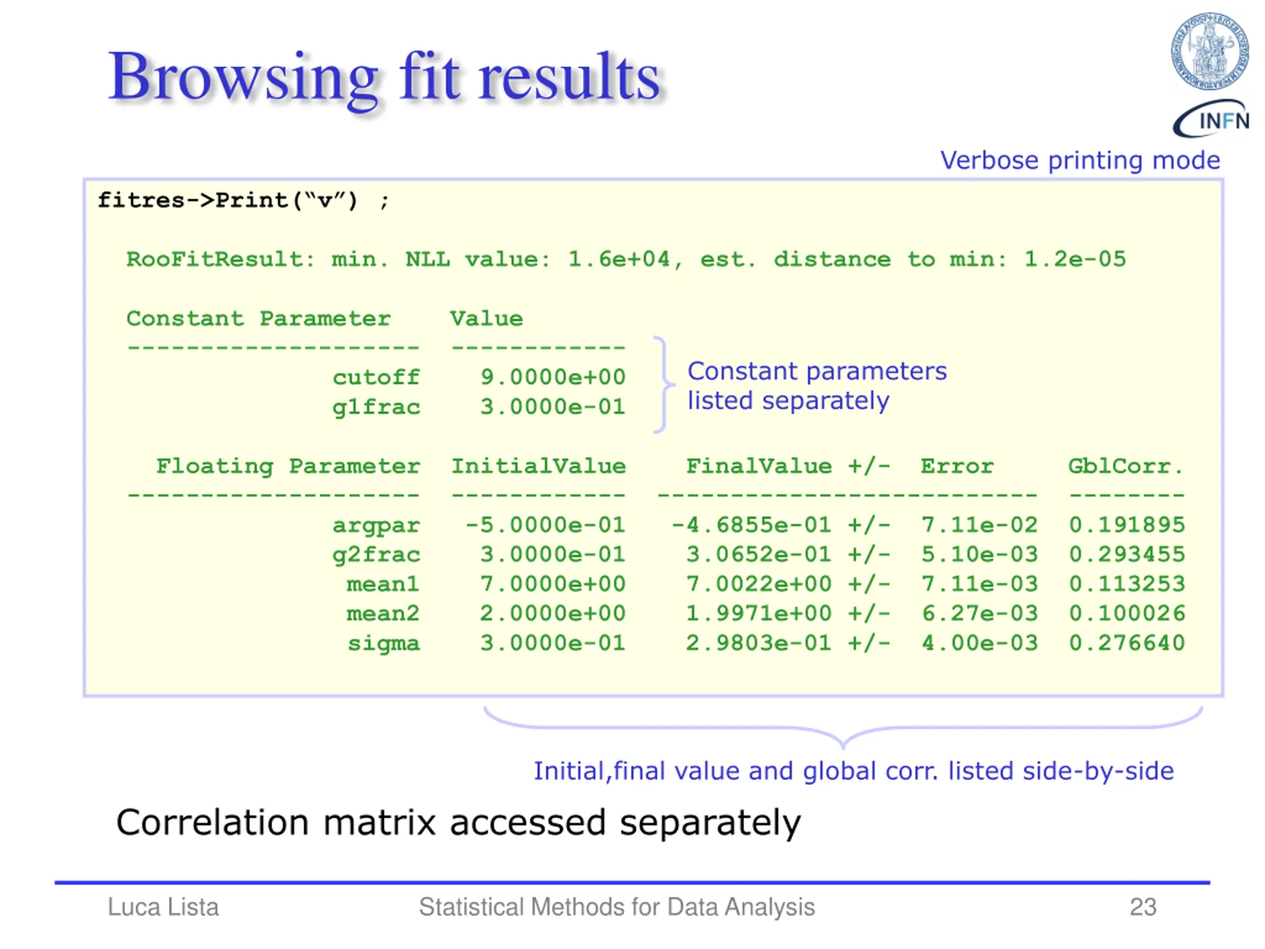 Browsing fit results As fits grow in complexity (e.g. 45 floating parameters), number of output variables increases Need better way to navigate output that MINUIT screen dump RooFitResult holds complete snapshot of fit results Constant parameters Initial and final values of floating parameters Global correlations & full correlation matrix Returned from RooAbsPdf::fitTo()when r option is supplied Compact & verbose printing mode Compact Mode Constant parameters omitted in compact mode fitres->Print() ; RooFitResult: min. NLL value: 1.6e+04, est. distance to min: 1.2e-05 Floating Parameter FinalValue +/- Error -------------------- -------------------------- argpar -4.6855e-01 +/- 7.11e-02 g2frac 3.0652e-01 +/- 5.10e-03 mean1 7.0022e+00 +/- 7.11e-03 mean2 1.9971e+00 +/- 6.27e-03 Alphabetical parameter listing Statistical Methods for Data Analysis sigma 2.9803e-01 +/- 4.00e-03 Luca Lista 22