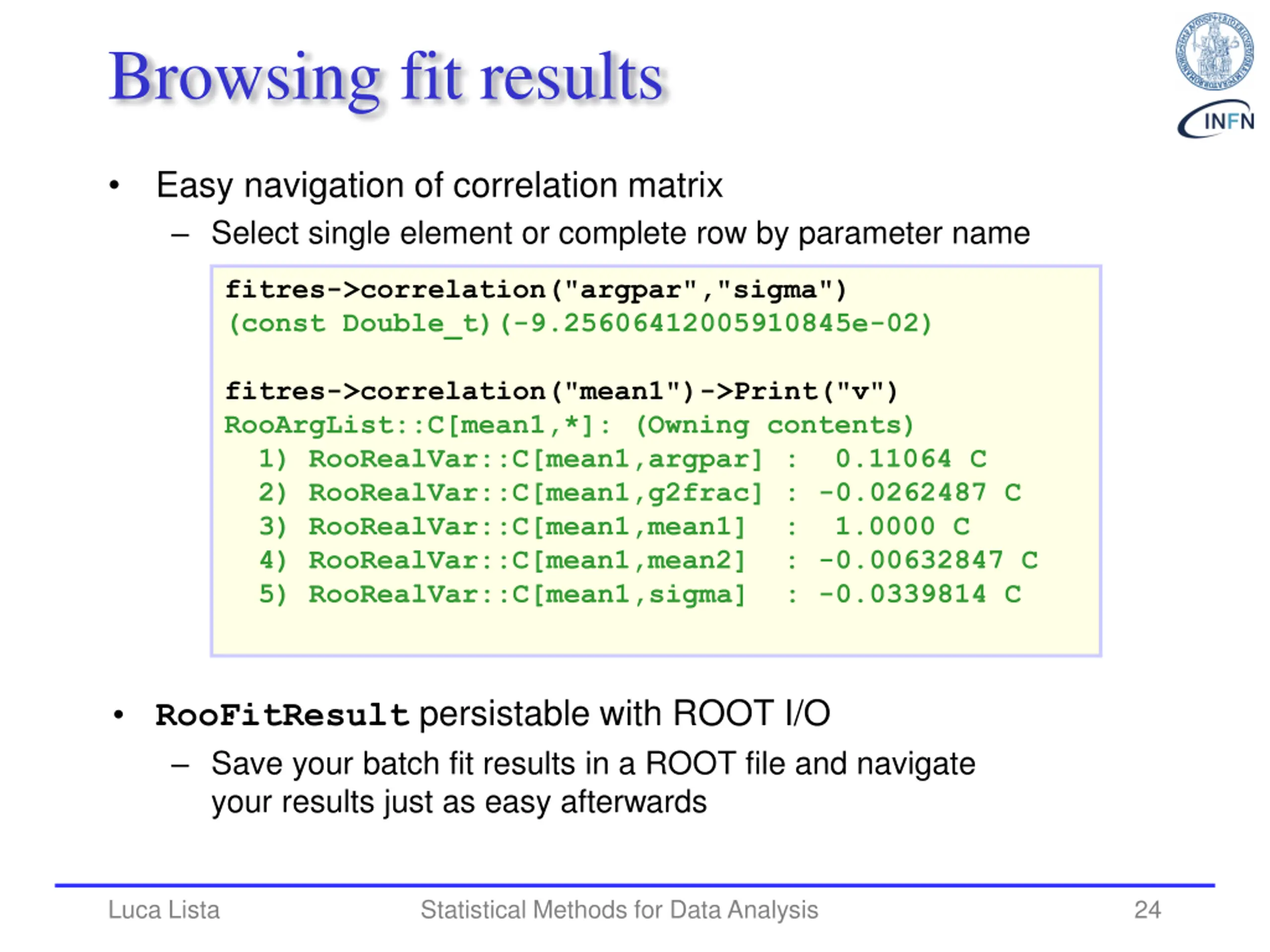 Browsing fit results Verbose printing mode fitres->Print( v ) ; RooFitResult: min. NLL value: 1.6e+04, est. distance to min: 1.2e-05 Constant Parameter Value -------------------- ------------ cutoff 9.0000e+00 g1frac 3.0000e-01 Constant parameters listed separately Floating Parameter InitialValue FinalValue +/- Error GblCorr. -------------------- ------------ -------------------------- -------- argpar -5.0000e-01 -4.6855e-01 +/- 7.11e-02 0.191895 g2frac 3.0000e-01 3.0652e-01 +/- 5.10e-03 0.293455 mean1 7.0000e+00 7.0022e+00 +/- 7.11e-03 0.113253 mean2 2.0000e+00 1.9971e+00 +/- 6.27e-03 0.100026 sigma 3.0000e-01 2.9803e-01 +/- 4.00e-03 0.276640 Initial,final value and global corr. listed side-by-side Correlation matrix accessed separately Luca Lista Statistical Methods for Data Analysis 23