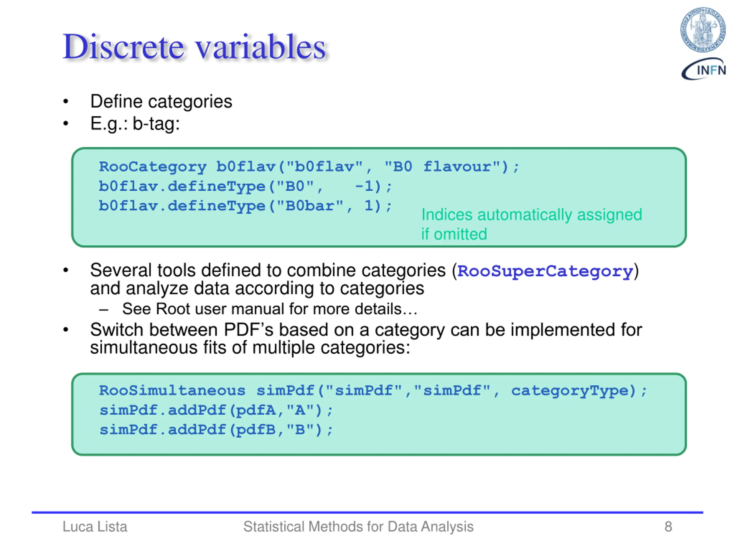 Discrete variables Define categories E.g.: b-tag: RooCategory b0flav("b0flav", "B0 flavour"); b0flav.defineType("B0", -1); b0flav.defineType("B0bar", 1); Indices automatically assigned if omitted Several tools defined to combine categories (RooSuperCategory) and analyze data according to categories See Root user manual for more details Switch between PDF s based on a category can be implemented for simultaneous fits of multiple categories: RooSimultaneous simPdf("simPdf","simPdf", categoryType); simPdf.addPdf(pdfA,"A"); simPdf.addPdf(pdfB,"B"); Luca Lista Statistical Methods for Data Analysis 8