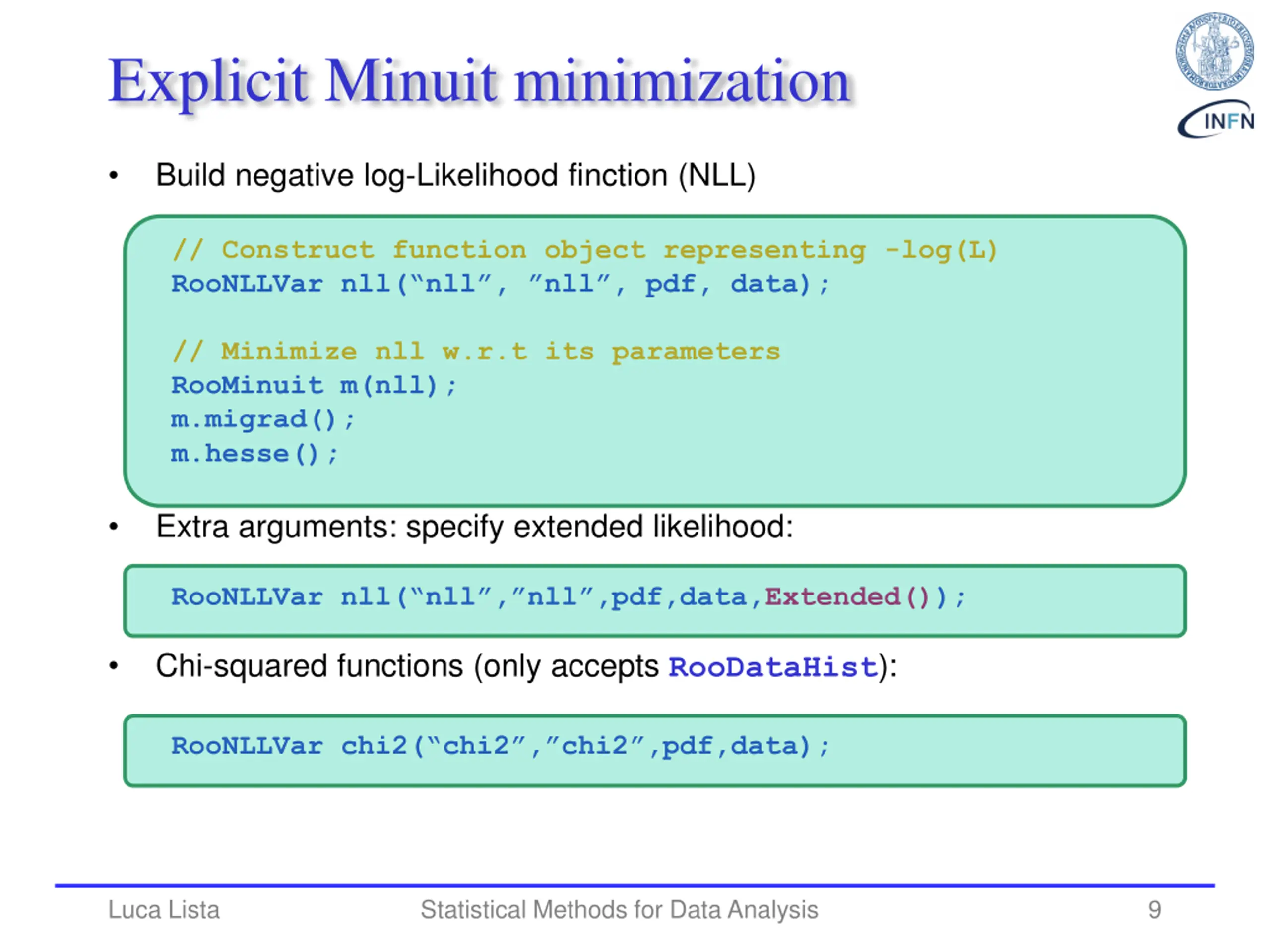 Explicit Minuit minimization Build negative log-Likelihood finction (NLL) // Construct function object representing -log(L) RooNLLVar nll( nll , nll , pdf, data); // Minimize nll w.r.t its parameters RooMinuit m(nll); m.migrad(); m.hesse(); Extra arguments: specify extended likelihood: RooNLLVar nll( nll , nll ,pdf,data,Extended()); Chi-squared functions (only accepts RooDataHist): RooNLLVar chi2( chi2 , chi2 ,pdf,data); Luca Lista Statistical Methods for Data Analysis 9