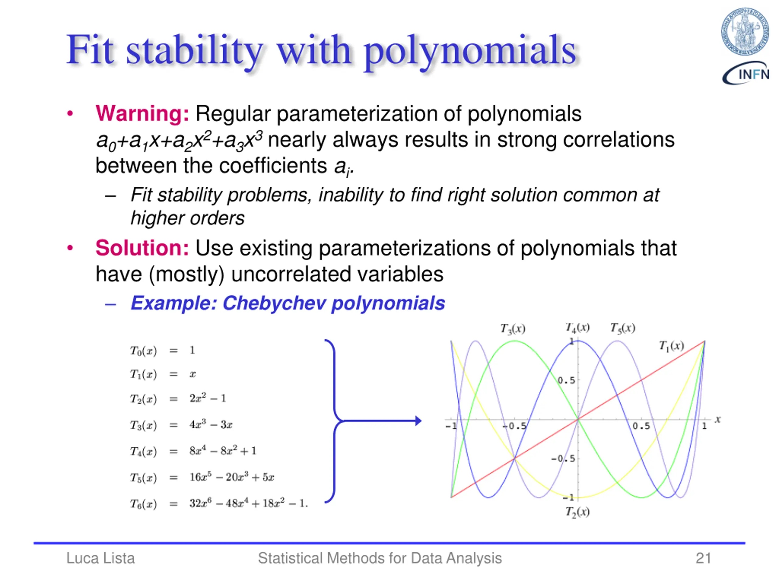 Fit stability with polynomials Warning: Regular parameterization of polynomials a0+a1x+a2x2+a3x3nearly always results in strong correlations between the coefficients ai. Fit stability problems, inability to find right solution common at higher orders Solution: Use existing parameterizations of polynomials that have (mostly) uncorrelated variables Example: Chebychev polynomials Luca Lista Statistical Methods for Data Analysis 21