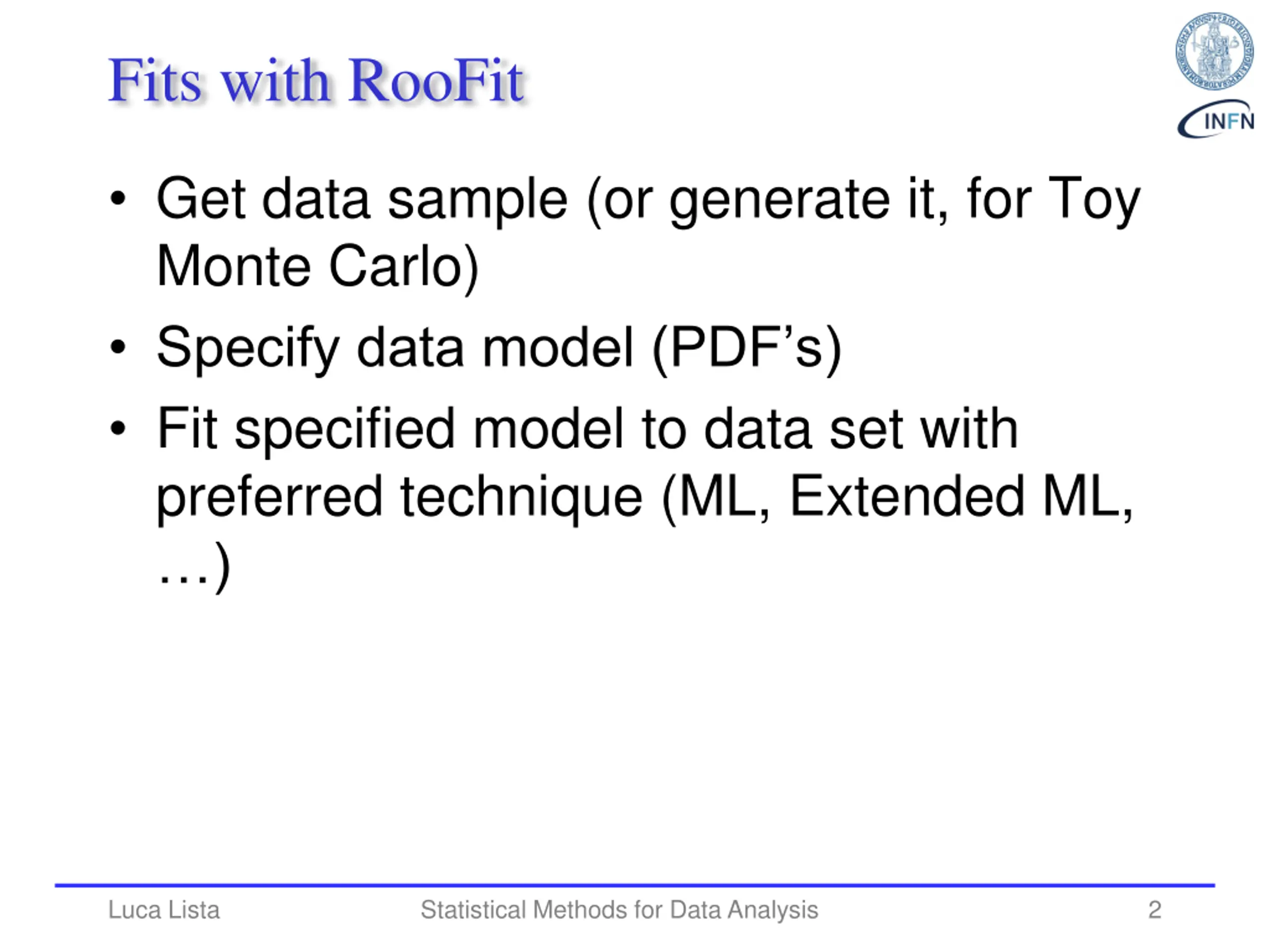 Fits with RooFit Get data sample (or generate it, for Toy Monte Carlo) Specify data model (PDF s) Fit specified model to data set with preferred technique (ML, Extended ML, ) Luca Lista Statistical Methods for Data Analysis 2