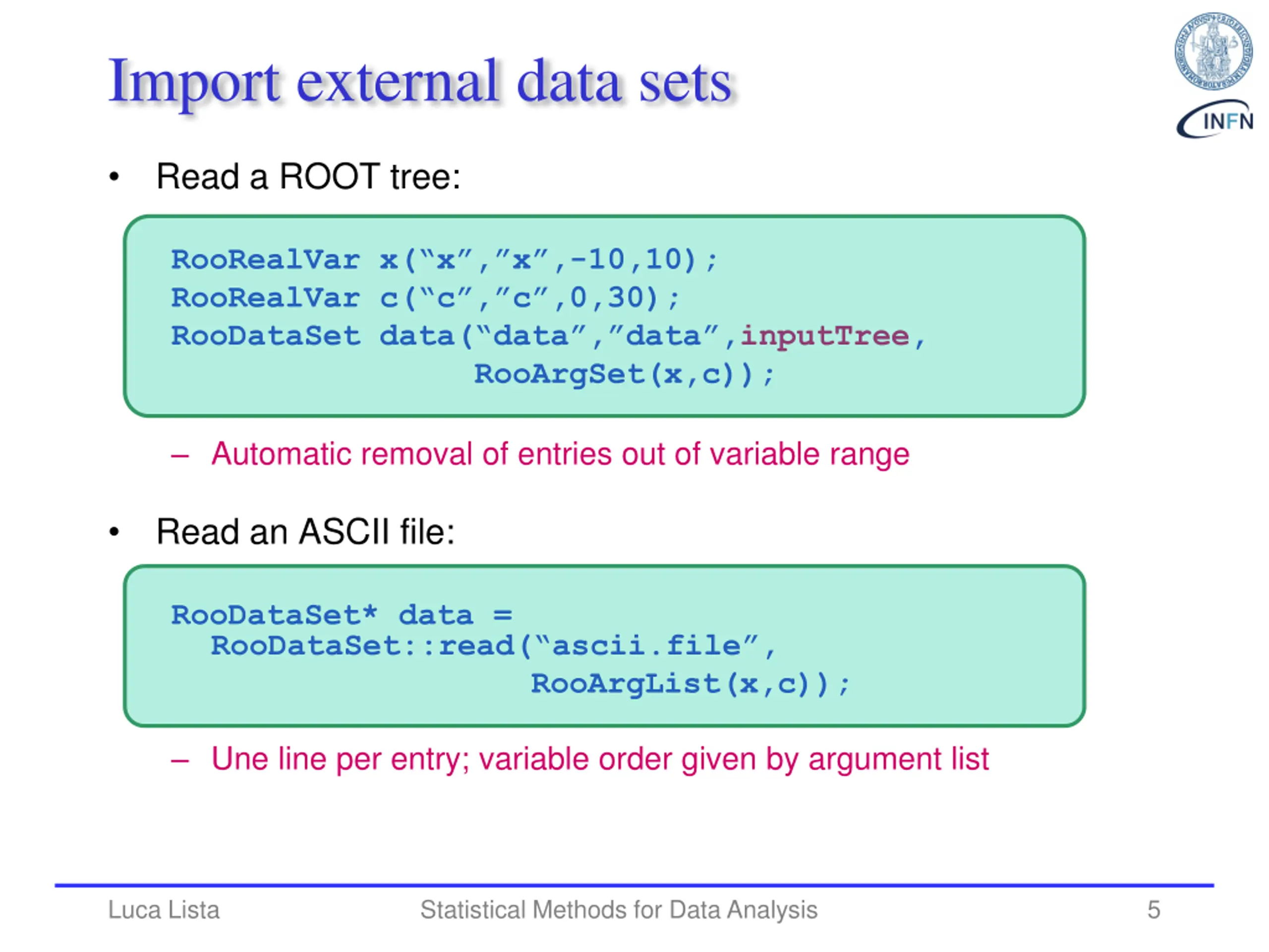 Import external data sets Read a ROOT tree: RooRealVar x( x , x ,-10,10); RooRealVar c( c , c ,0,30); RooDataSet data( data , data ,inputTree, RooArgSet(x,c)); Automatic removal of entries out of variable range Read an ASCII file: RooDataSet* data = RooDataSet::read( ascii.file , RooArgList(x,c)); Une line per entry; variable order given by argument list Luca Lista Statistical Methods for Data Analysis 5