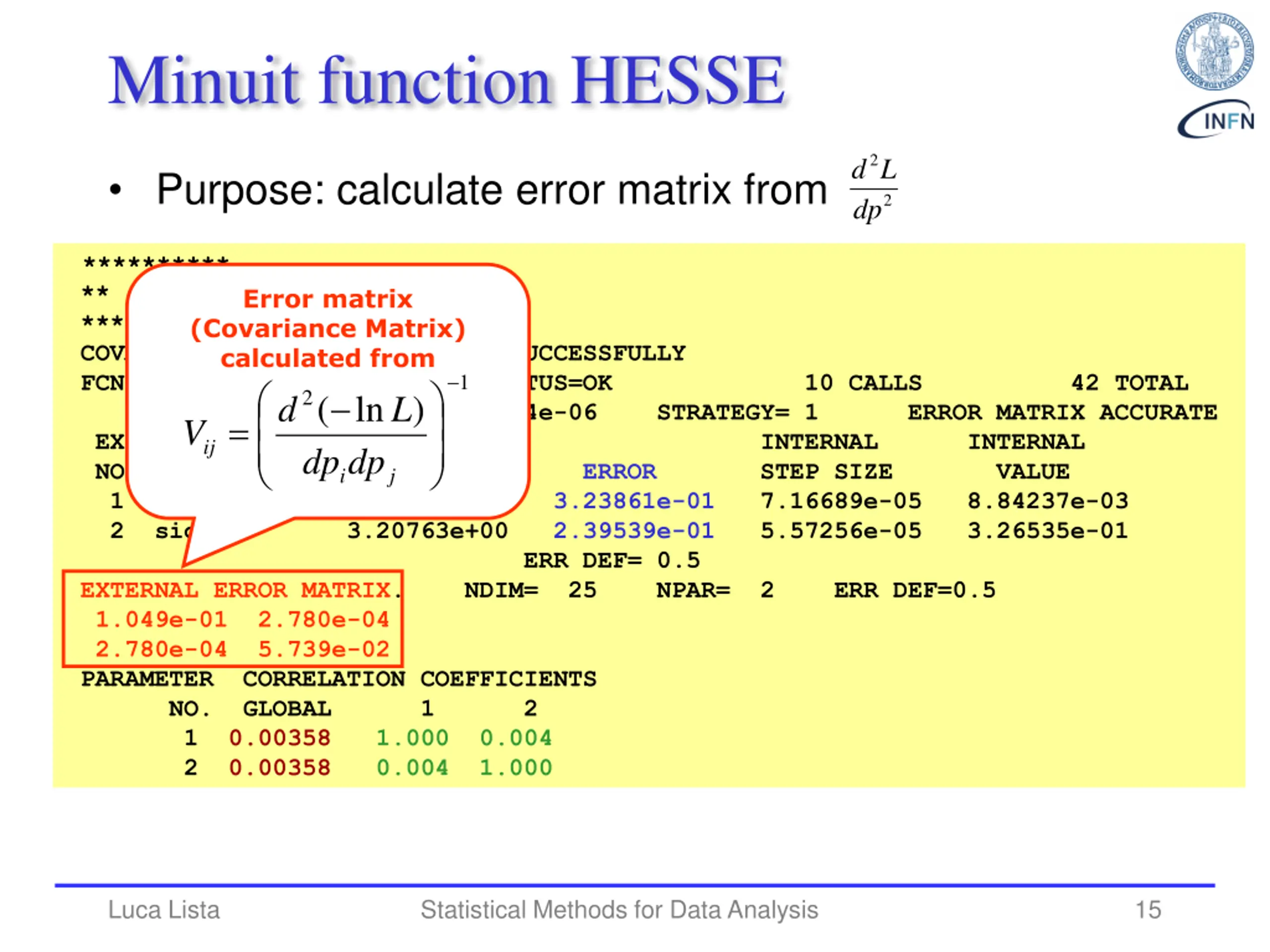 Minuit function HESSE 2 d L Purpose: calculate error matrix from 2 dp ********** ** 18 **HESSE 1000 ********** COVARIANCE MATRIX CALCULATED SUCCESSFULLY FCN=257.304 FROM HESSE STATUS=OK 10 CALLS 42 TOTAL EDM=2.36534e-06 STRATEGY= 1 ERROR MATRIX ACCURATE EXT PARAMETER INTERNAL INTERNAL NO. NAME VALUE ERROR 1 mean 8.84225e-02 3.23861e-01 7.16689e-05 8.84237e-03 2 sigma 3.20763e+00 2.39539e-01 5.57256e-05 3.26535e-01 ERR DEF= 0.5 EXTERNAL ERROR MATRIX. NDIM= 25 NPAR= 2 ERR DEF=0.5 1.049e-01 2.780e-04 2.780e-04 5.739e-02 PARAMETER CORRELATION COEFFICIENTS NO. GLOBAL 1 2 1 0.00358 1.000 0.004 2 0.00358 0.004 1.000 Symmetric errors calculated from 2nd derivative of ln(L) or 2 STEP SIZE VALUE Luca Lista Statistical Methods for Data Analysis 14