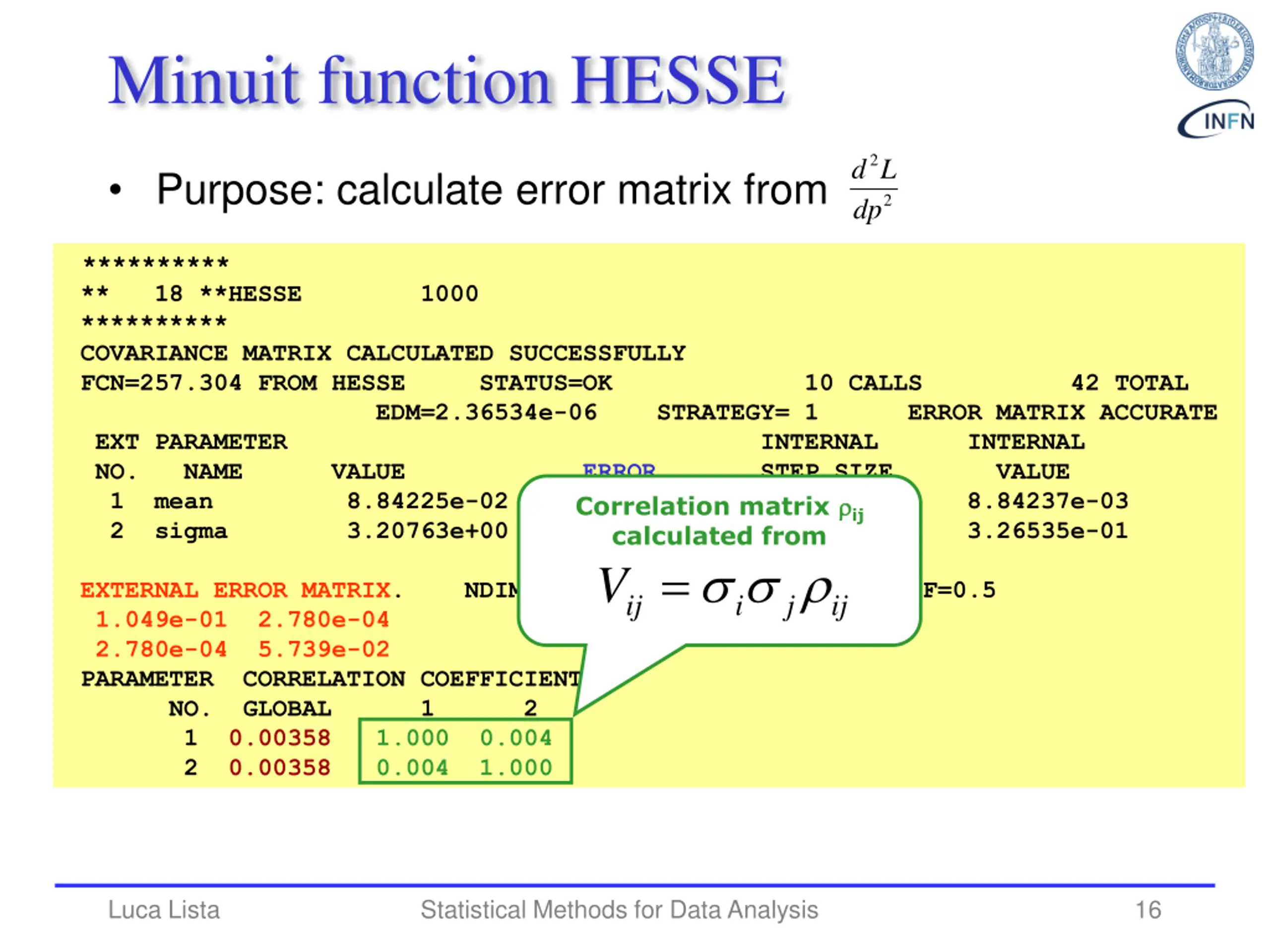 Minuit function HESSE 2 d L Purpose: calculate error matrix from 2 dp ********** ** 18 **HESSE 1000 ********** COVARIANCE MATRIX CALCULATED SUCCESSFULLY FCN=257.304 FROM HESSE STATUS=OK 10 CALLS 42 TOTAL EDM=2.36534e-06 STRATEGY= 1 ERROR MATRIX ACCURATE EXT PARAMETER INTERNAL INTERNAL NO. NAME VALUE ERROR 1 mean 8.84225e-02 3.23861e-01 7.16689e-05 8.84237e-03 2 sigma 3.20763e+00 2.39539e-01 5.57256e-05 3.26535e-01 ERR DEF= 0.5 EXTERNAL ERROR MATRIX. NDIM= 25 NPAR= 2 ERR DEF=0.5 1.049e-01 2.780e-04 2.780e-04 5.739e-02 PARAMETER CORRELATION COEFFICIENTS NO. GLOBAL 1 2 1 0.00358 1.000 0.004 2 0.00358 0.004 1.000 Error matrix (Covariance Matrix) calculated from ( 1 2 ln dp ) d L = V ij dp STEP SIZE VALUE i j Luca Lista Statistical Methods for Data Analysis 15