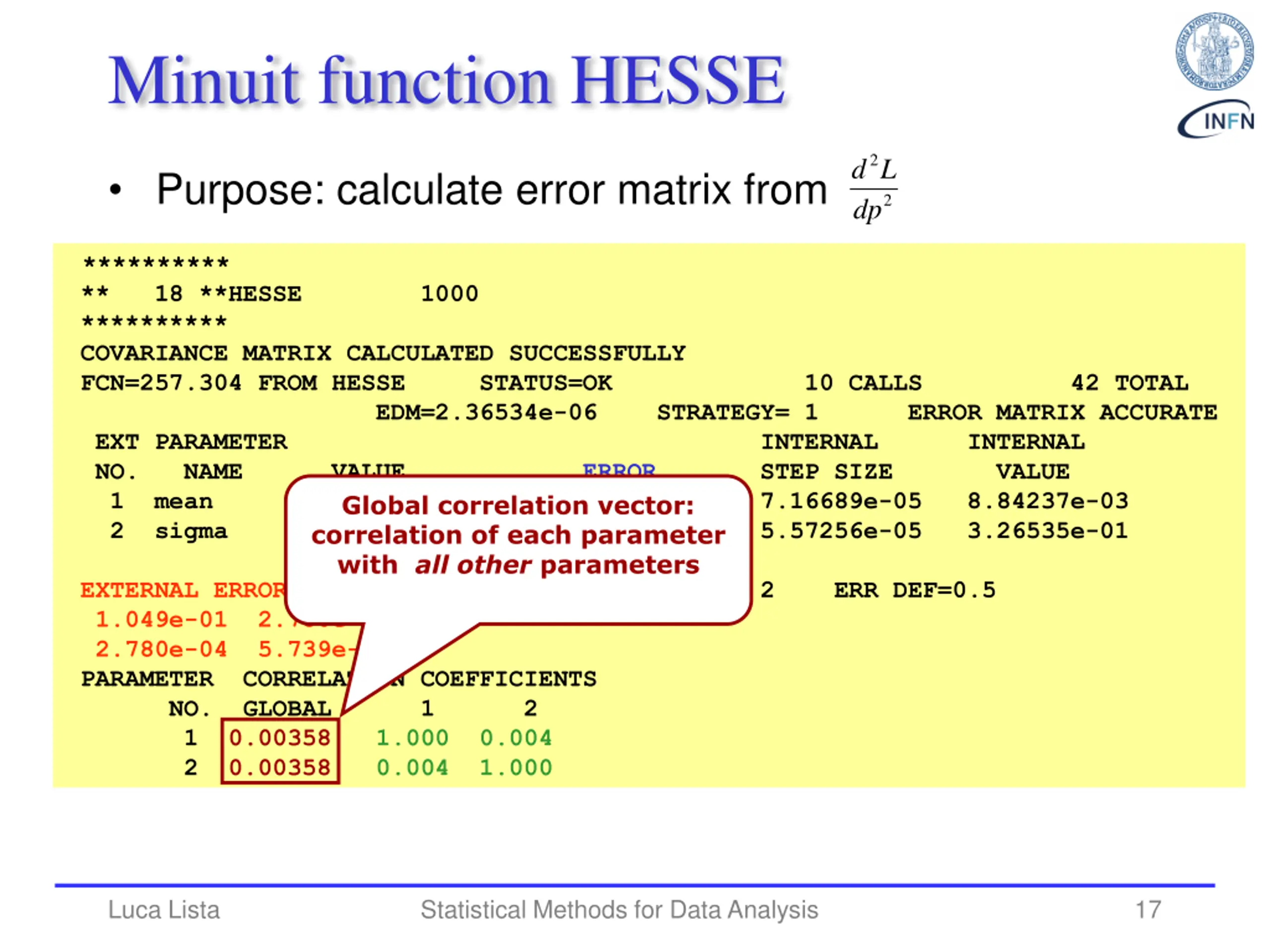 Minuit function HESSE 2 d L Purpose: calculate error matrix from 2 dp ********** ** 18 **HESSE 1000 ********** COVARIANCE MATRIX CALCULATED SUCCESSFULLY FCN=257.304 FROM HESSE STATUS=OK 10 CALLS 42 TOTAL EDM=2.36534e-06 STRATEGY= 1 ERROR MATRIX ACCURATE EXT PARAMETER INTERNAL INTERNAL NO. NAME VALUE ERROR 1 mean 8.84225e-02 3.23861e-01 7.16689e-05 8.84237e-03 2 sigma 3.20763e+00 2.39539e-01 5.57256e-05 3.26535e-01 ERR DEF= 0.5 EXTERNAL ERROR MATRIX. NDIM= 25 NPAR= 2 ERR DEF=0.5 1.049e-01 2.780e-04 2.780e-04 5.739e-02 PARAMETER CORRELATION COEFFICIENTS NO. GLOBAL 1 2 1 0.00358 1.000 0.004 2 0.00358 0.004 1.000 STEP SIZE VALUE Global correlation vector: correlation of each parameter with all other parameters Luca Lista Statistical Methods for Data Analysis 17