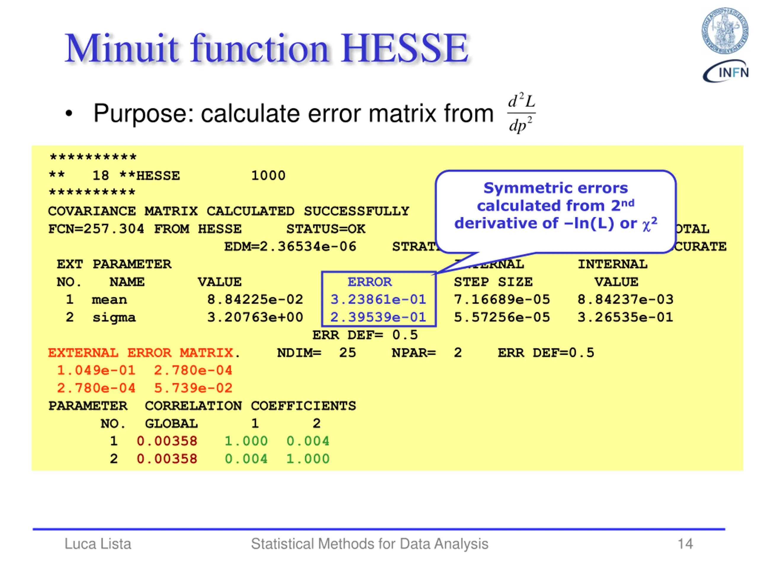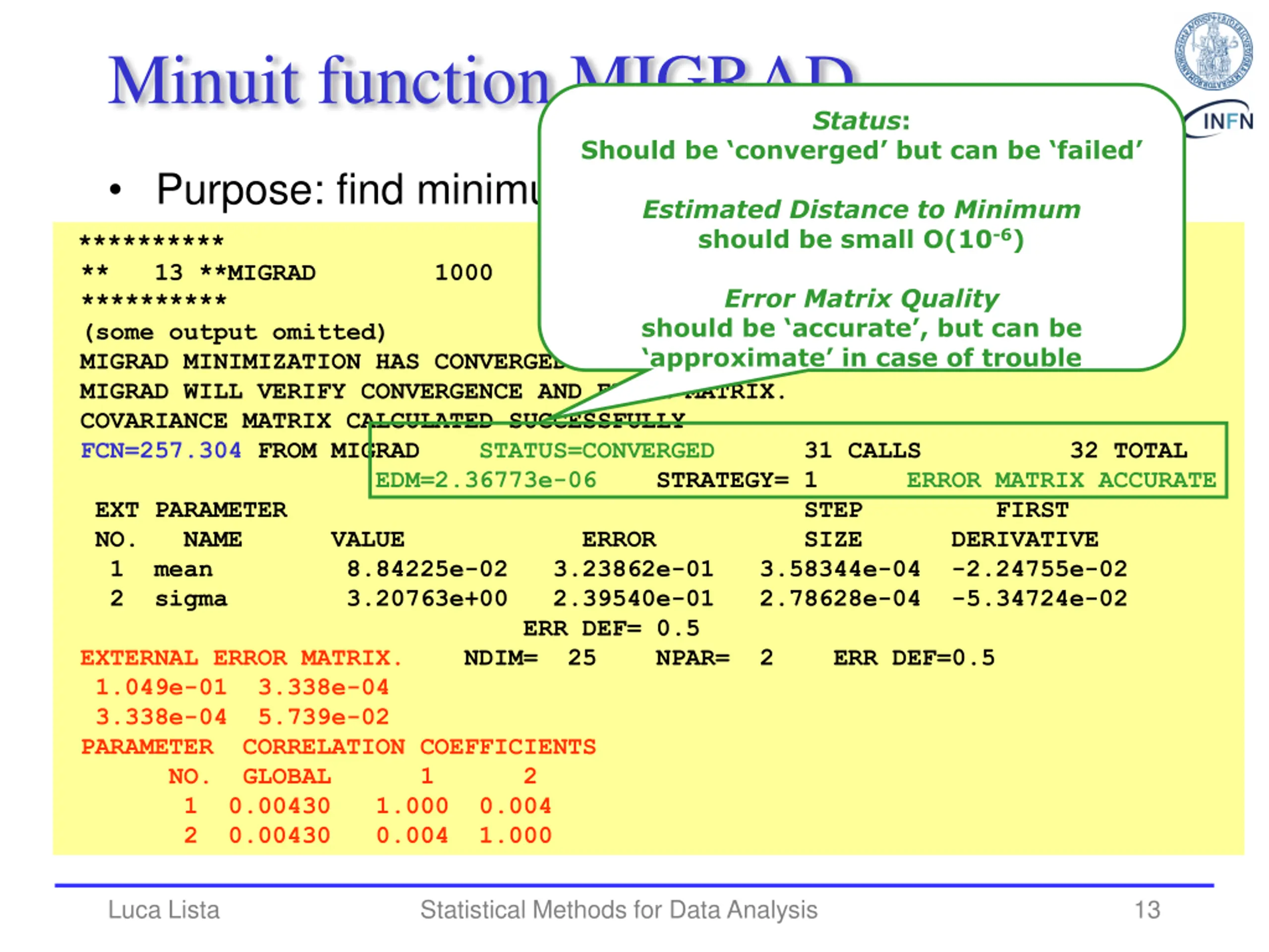 Minuit function MIGRAD Purpose: find minimum Value of 2 or likelihood at ********** ** 13 **MIGRAD 1000 1 ********** (some output omitted) MIGRAD MINIMIZATION HAS CONVERGED. MIGRAD WILL VERIFY CONVERGENCE AND ERROR MATRIX. COVARIANCE MATRIX CALCULATED SUCCESSFULLY FCN=257.304 FROM MIGRAD STATUS=CONVERGED 31 CALLS 32 TOTAL EDM=2.36773e-06 STRATEGY= 1 ERROR MATRIX ACCURATE EXT PARAMETER STEP FIRST NO. NAME VALUE ERROR SIZE DERIVATIVE 1 mean 8.84225e-02 3.23862e-01 3.58344e-04 -2.24755e-02 2 sigma 3.20763e+00 2.39540e-01 2.78628e-04 -5.34724e-02 ERR DEF= 0.5 EXTERNAL ERROR MATRIX. NDIM= 25 NPAR= 2 ERR DEF=0.5 1.049e-01 3.338e-04 3.338e-04 5.739e-02 PARAMETER CORRELATION COEFFICIENTS NO. GLOBAL 1 2 1 0.00430 1.000 0.004 2 0.00430 0.004 1.000 minimum (NB: 2 values are not divided by Nd.o.f) Approximate Error matrix And covariance matrix Luca Lista Statistical Methods for Data Analysis 12