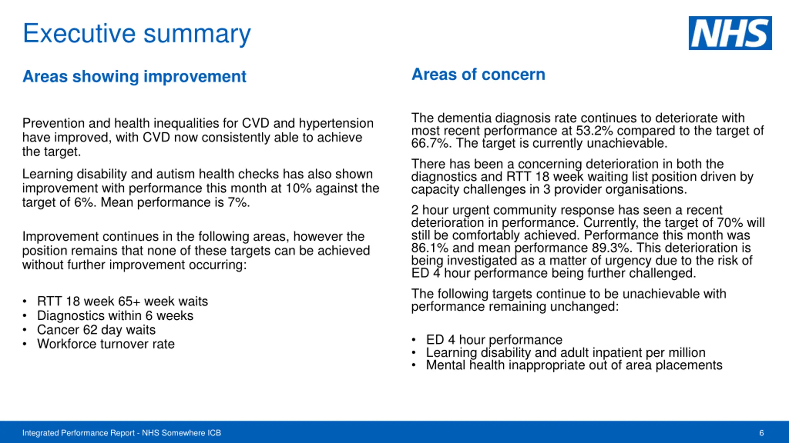 Integrated Performance Report NHS Somewhere ICB March 2024 data [This sample report contains a range of visualisations and page formats which are useful in guiding board level conversations. ICBs are encouraged to consider the most appropriate format for local use and which view of data is most useful for each measure (place or provider). It is recommended that once agreed, a consistent format and style is adopted for all sections of the integrated performance report.]