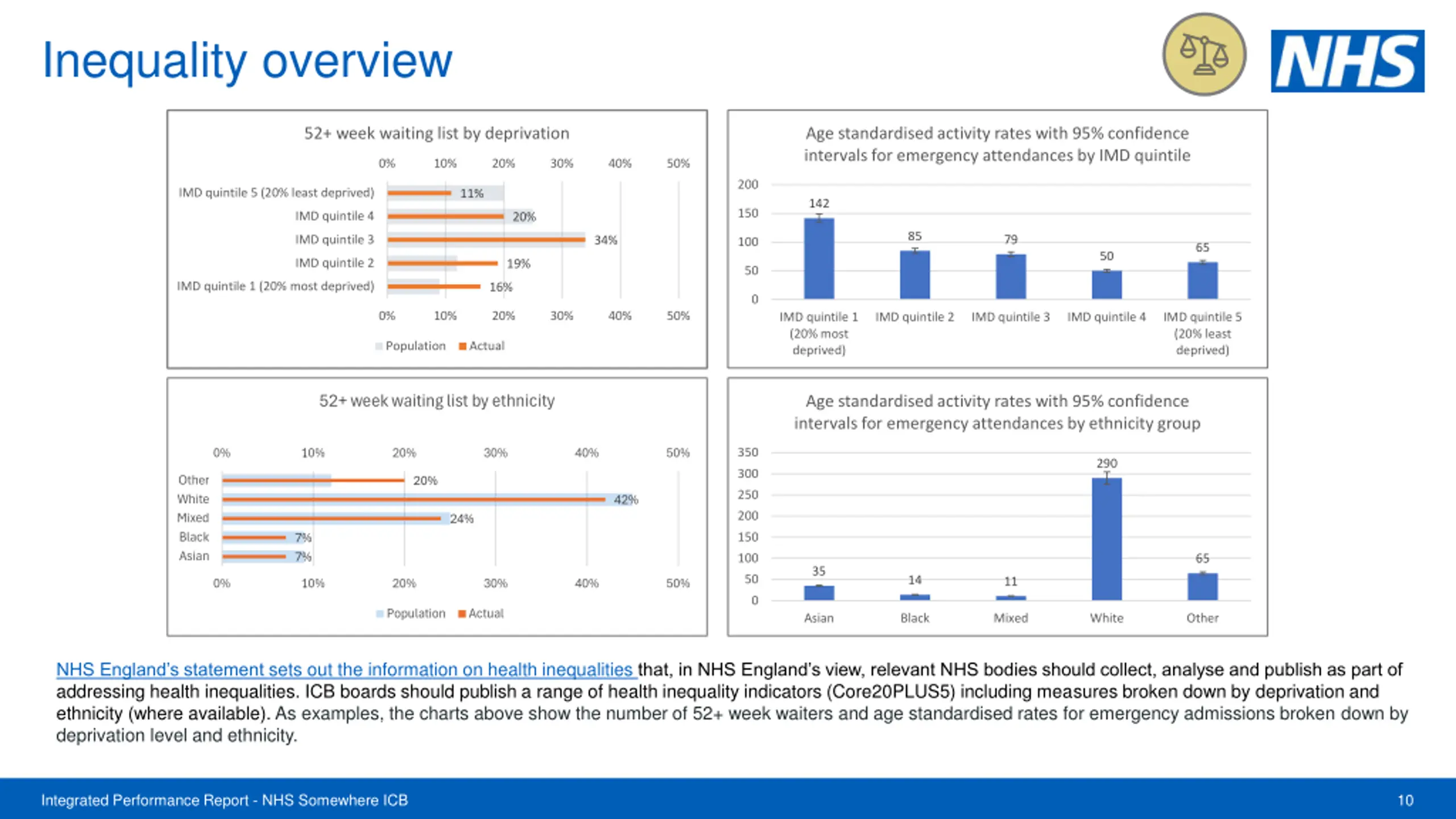 Inequality overview Age standardised activity rates with 95% confidence intervals for emergency attendances by IMD quintile 52+ week waiting list by deprivation 0% 10% 20% 30% 40% 50% 200 IMD quintile 5 (20% least deprived) 11% 142 150 IMD quintile 4 20% 85 79 IMD quintile 3 34% 100 65 50 IMD quintile 2 19% 50 IMD quintile 1 (20% most deprived) 16% 0 0% 10% 20% 30% 40% 50% IMD quintile 1 (20% most deprived) IMD quintile 2 IMD quintile 3 IMD quintile 4 IMD quintile 5 (20% least deprived) Population Actual 52+ week waiting list by ethnicity Age standardised activity rates with 95% confidence intervals for emergency attendances by ethnicity group 0% 10% 20% 30% 40% 50% 350 290 300 Other 20% 250 White 42% Mixed 200 24% Black 7% 150 Asian 7% 100 65 35 50 14 0% 10% 20% 30% 40% 50% 11 0 Population Actual Asian Black Mixed White Other NHS England s statement sets out the information on health inequalities that, in NHS England s view, relevant NHS bodies should collect, analyse and publish as part of addressing health inequalities. ICB boards should publish a range of health inequality indicators (Core20PLUS5) including measures broken down by deprivation and ethnicity (where available). As examples, the charts above show the number of 52+ week waiters and age standardised rates for emergency admissions broken down by deprivation level and ethnicity. Integrated Performance Report - NHS Somewhere ICB 10