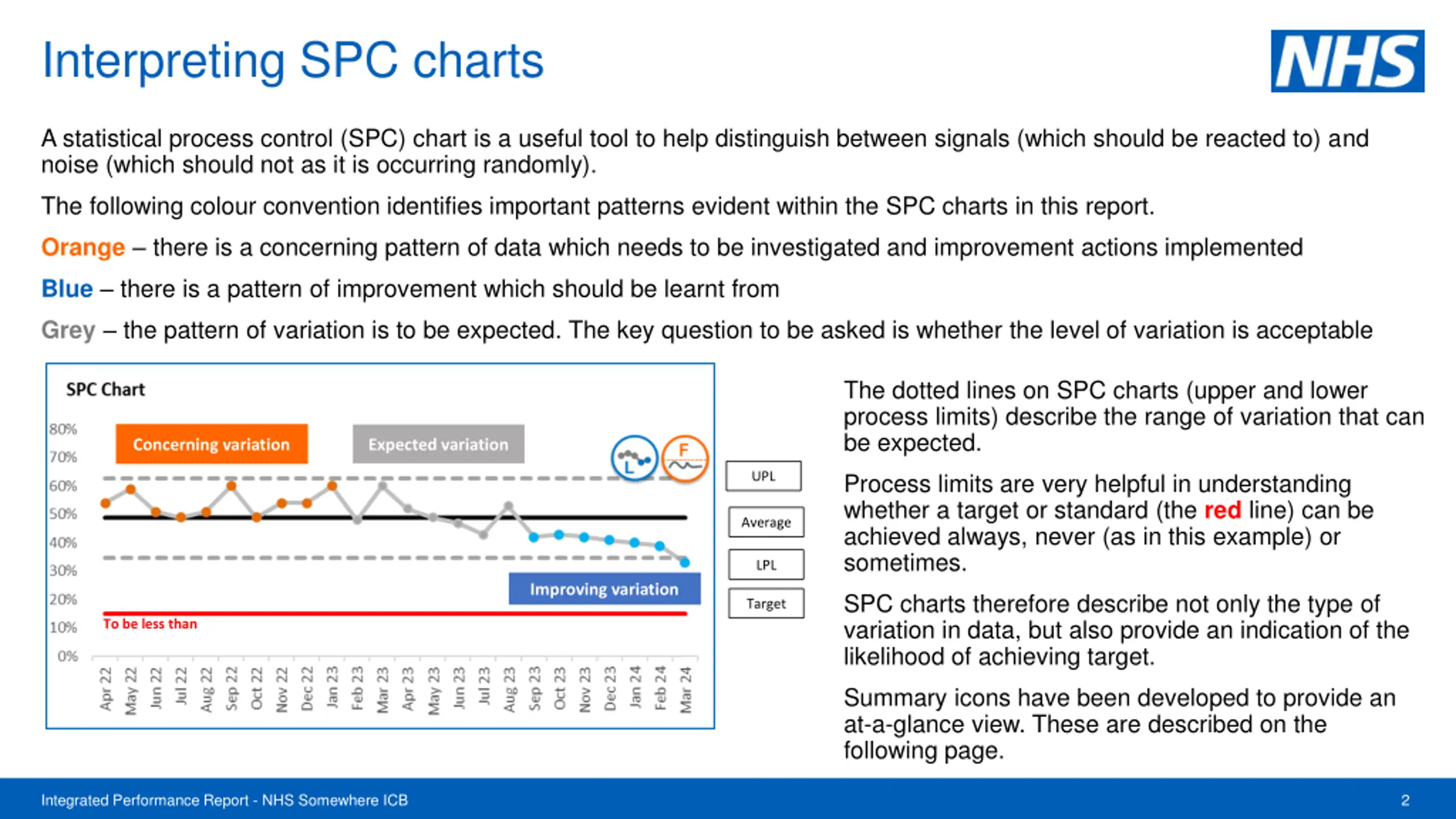 Interpreting SPC charts A statistical process control (SPC) chart is a useful tool to help distinguish between signals (which should be reacted to) and noise (which should not as it is occurring randomly). The following colour convention identifies important patterns evident within the SPC charts in this report. Orange there is a concerning pattern of data which needs to be investigated and improvement actions implemented Blue there is a pattern of improvement which should be learnt from Grey the pattern of variation is to be expected. The key question to be asked is whether the level of variation is acceptable The dotted lines on SPC charts (upper and lower process limits) describe the range of variation that can be expected. Concerning variation Expected variation Process limits are very helpful in understanding whether a target or standard (the red line) can be achieved always, never (as in this example) or sometimes. UPL Average LPL Improving variation SPC charts therefore describe not only the type of variation in data, but also provide an indication of the likelihood of achieving target. Target To be less than Summary icons have been developed to provide an at-a-glance view. These are described on the following page. Integrated Performance Report - NHS Somewhere ICB 2