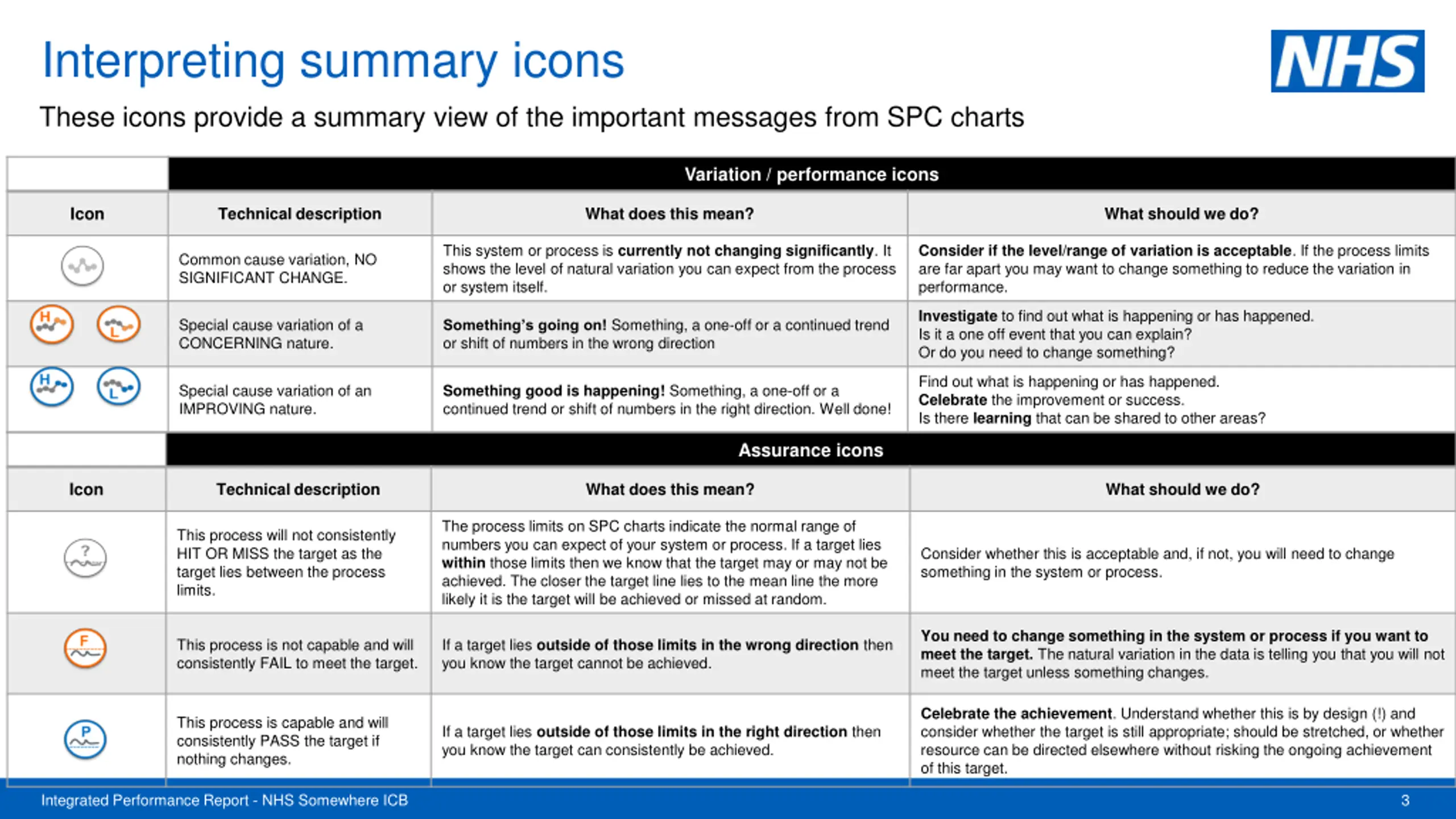 Interpreting summary icons These icons provide a summary view of the important messages from SPC charts Variation / performance icons Icon Technical description What does this mean? What should we do? This system or process is currently not changing significantly. It shows the level of natural variation you can expect from the process or system itself. Consider if the level/range of variation is acceptable. If the process limits are far apart you may want to change something to reduce the variation in performance. Common cause variation, NO SIGNIFICANT CHANGE. Investigate to find out what is happening or has happened. Is it a one off event that you can explain? Or do you need to change something? Special cause variation of a CONCERNING nature. Something s going on! Something, a one-off or a continued trend or shift of numbers in the wrong direction Find out what is happening or has happened. Celebrate the improvement or success. Is there learning that can be shared to other areas? Special cause variation of an IMPROVING nature. Something good is happening! Something, a one-off or a continued trend or shift of numbers in the right direction. Well done! Assurance icons Icon Technical description What does this mean? What should we do? The process limits on SPC charts indicate the normal range of numbers you can expect of your system or process. If a target lies within those limits then we know that the target may or may not be achieved. The closer the target line lies to the mean line the more likely it is the target will be achieved or missed at random. This process will not consistently HIT OR MISS the target as the target lies between the process limits. Consider whether this is acceptable and, if not, you will need to change something in the system or process. You need to change something in the system or process if you want to meet the target. The natural variation in the data is telling you that you will not meet the target unless something changes. This process is not capable and will consistently FAIL to meet the target. If a target lies outside of those limits in the wrong direction then you know the target cannot be achieved. Celebrate the achievement. Understand whether this is by design (!) and consider whether the target is still appropriate; should be stretched, or whether resource can be directed elsewhere without risking the ongoing achievement of this target. This process is capable and will consistently PASS the target if nothing changes. If a target lies outside of those limits in the right direction then you know the target can consistently be achieved. Integrated Performance Report - NHS Somewhere ICB 3