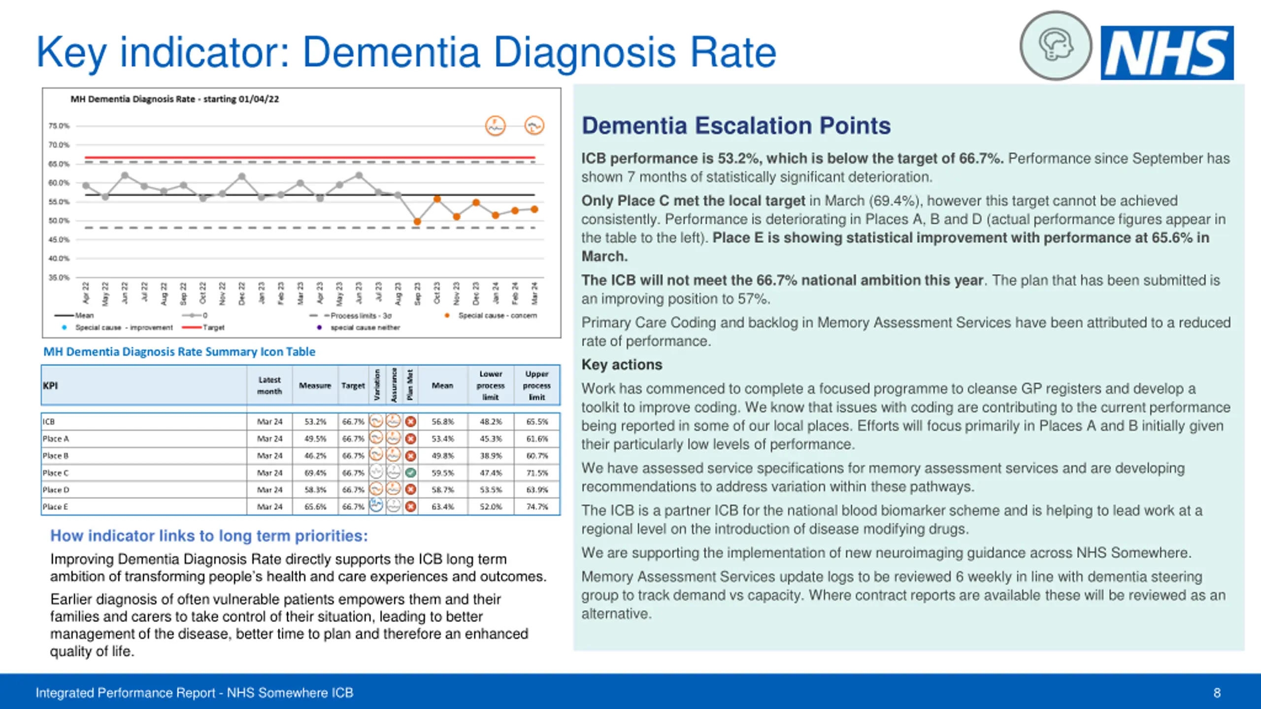 Key indicator: Dementia Diagnosis Rate Dementia Escalation Points ICB performance is53.2%, which is below the target of 66.7%. Performance since September has shown 7 months of statistically significant deterioration. Only Place C met the local target in March (69.4%), however this target cannot be achieved consistently. Performance is deteriorating in Places A, B and D (actual performance figures appear in the table to the left). Place E is showing statistical improvement with performance at 65.6% in March. The ICB will not meet the 66.7% national ambition this year. The plan that has been submitted is an improving position to 57%. Primary Care Coding and backlog in Memory Assessment Services have been attributed to a reduced rate of performance. Key actions Work has commenced to complete a focused programme to cleanse GP registers and develop a toolkit to improve coding. We know that issues with coding are contributing to the current performance being reported in some of our local places. Efforts will focus primarily in Places A and B initially given their particularly low levels of performance. We have assessed service specifications for memory assessment services and are developing recommendations to address variation within these pathways. The ICB is a partner ICB for the national blood biomarker scheme and is helping to lead work at a regional level on the introduction of disease modifying drugs. We are supporting the implementation of new neuroimaging guidance across NHS Somewhere. Memory Assessment Services update logs to be reviewed 6 weekly in line with dementia steering group to track demand vs capacity. Where contract reports are available these will be reviewed as an alternative. MH Dementia Diagnosis Rate Summary Icon Table Assurance Variation Plan Met Lower process limit Upper process limit Latest month KPI Measure Target Mean ICB Mar 24 53.2% 66.7% 56.8% 48.2% 65.5% Place A Mar 24 49.5% 66.7% 53.4% 45.3% 61.6% Place B Mar 24 46.2% 66.7% 49.8% 38.9% 60.7% Place C Mar 24 69.4% 66.7% 59.5% 47.4% 71.5% Place D Mar 24 58.3% 66.7% 58.7% 53.5% 63.9% Place E Mar 24 65.6% 66.7% 63.4% 52.0% 74.7% How indicator links to long term priorities: Improving Dementia Diagnosis Rate directly supports the ICB long term ambition of transforming people s health and care experiences and outcomes. Earlier diagnosis of often vulnerable patients empowers them and their families and carers to take control of their situation, leading to better management of the disease, better time to plan and therefore an enhanced quality of life. Integrated Performance Report - NHS Somewhere ICB 8