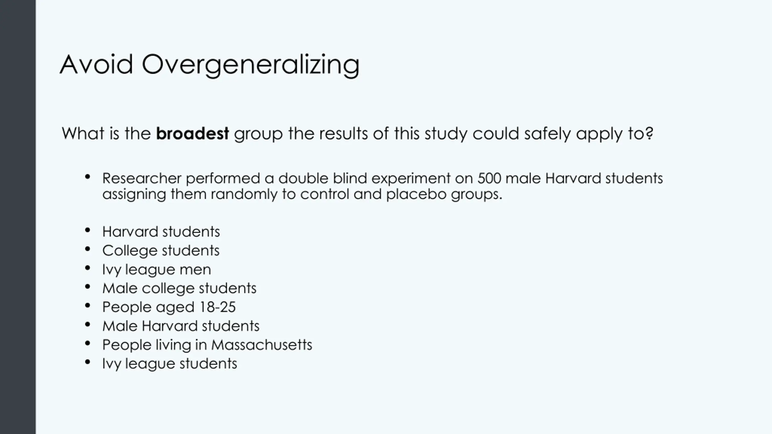 Avoid Overgeneralizing What is the broadest group the results of this study could safely apply to? Researcher performed a double blind experiment on 500 male Harvard students assigning them randomly to control and placebo groups. Harvard students College students Ivy league men Male college students People aged 18-25 Male Harvard students People living in Massachusetts Ivy league students