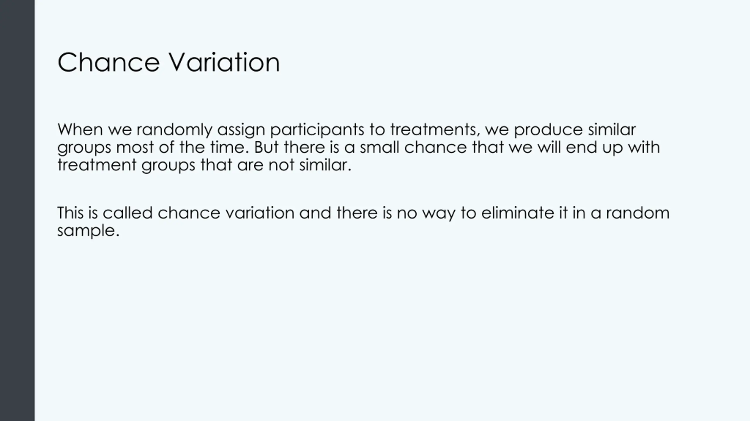 Chance Variation When we randomly assign participants to treatments, we produce similar groups most of the time. But there is a small chance that we will end up with treatment groups that are not similar. This is called chance variation and there is no way to eliminate it in a random sample.