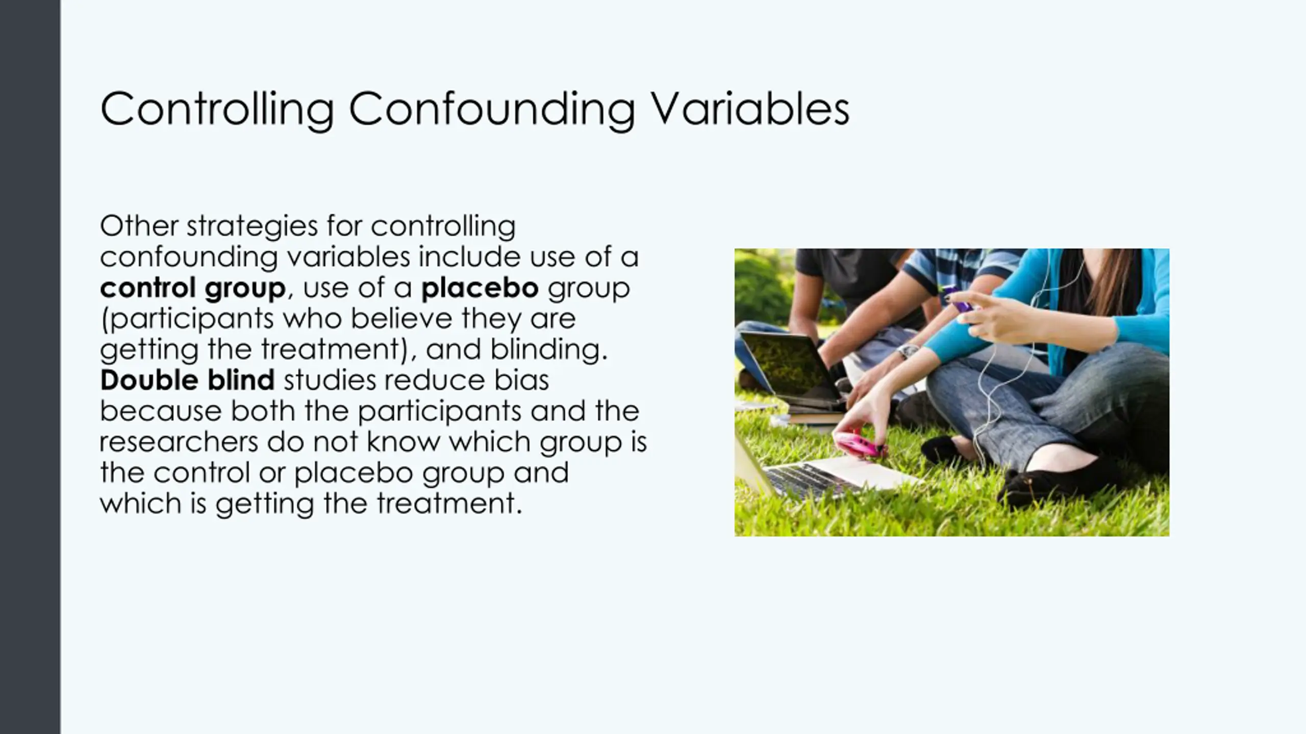 Controlling Confounding Variables Other strategies for controlling confounding variables include use of a control group, use of a placebo group (participants who believe they are getting the treatment), and blinding. Double blind studies reduce bias because both the participants and the researchers do not know which group is the control or placebo group and which is getting the treatment.