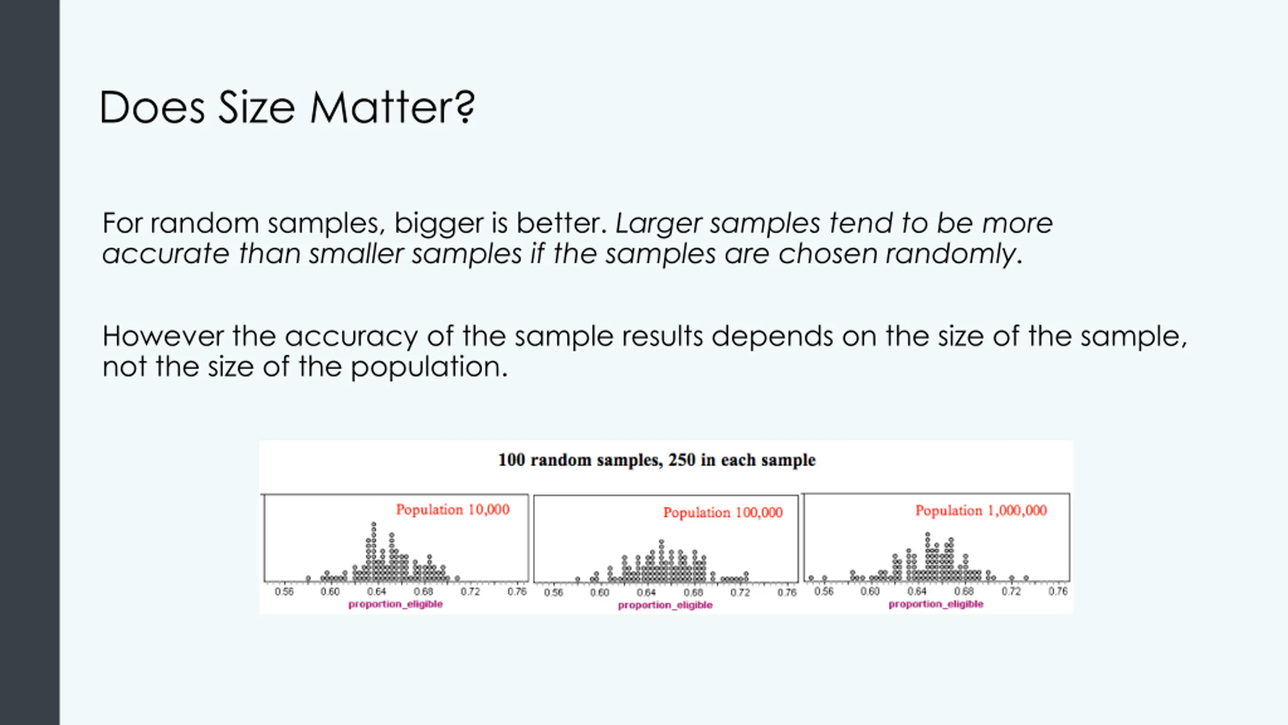 Does Size Matter? For random samples, bigger is better. Larger samples tend to be more accurate than smaller samples if the samples are chosen randomly. However the accuracy of the sample results depends on the size of the sample, not the size of the population.