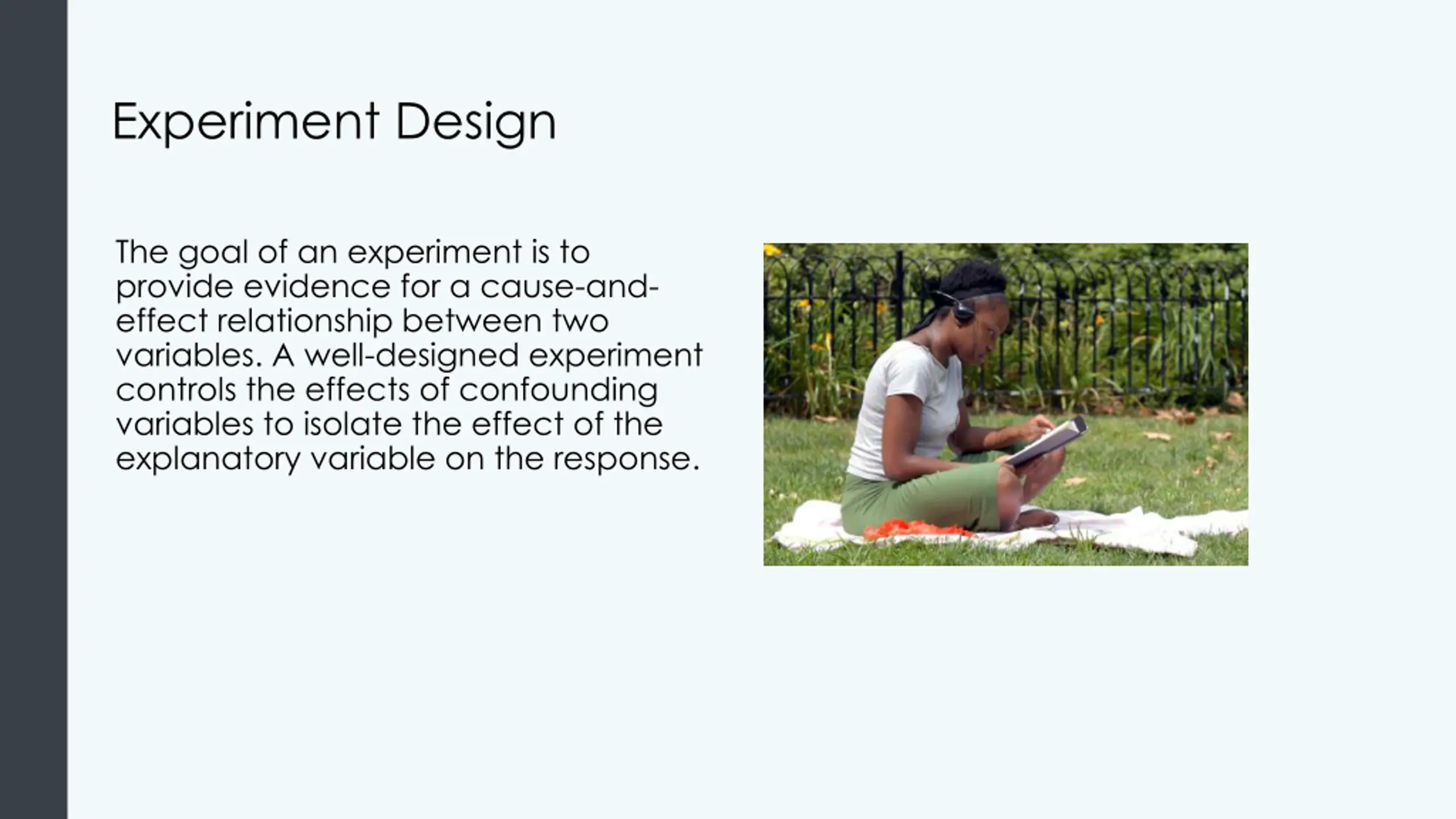 Experiment Design The goal of an experiment is to provide evidence for a cause-and- effect relationship between two variables. A well-designed experiment controls the effects of confounding variables to isolate the effect of the explanatory variable on the response.